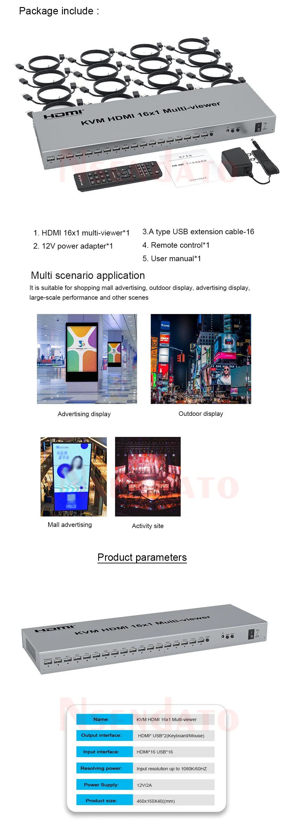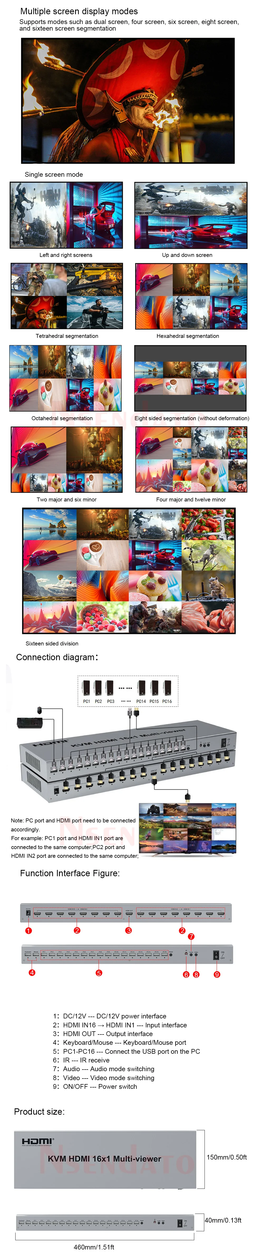 HDMI 16x1 Multiviewer es un producto de alto rendimiento con 16 segmentación de pantalla HD y salida de conmutación perfecta.Puede mostrar 16 señales de vídeo digital HD en la misma pantalla y tiene una variedad de segmentación de vídeo, conmutando sin problemas 16 señales de entrada HD de forma sincrónica.Los métodos de control del Multiviewer son flexibles, se pueden cambiar mediante botón y control IR.Es un multivisor muy práctico y estable y fácil de instalar, se puede utilizar en proyectos importantes, salas de reuniones y otros lugares.