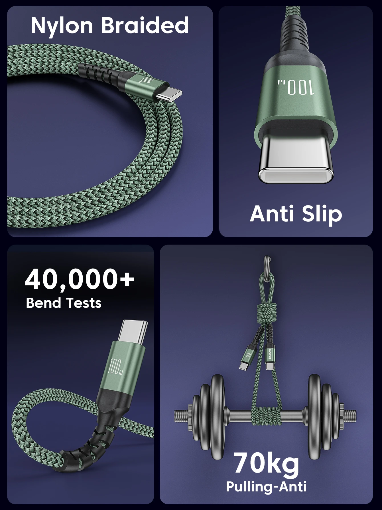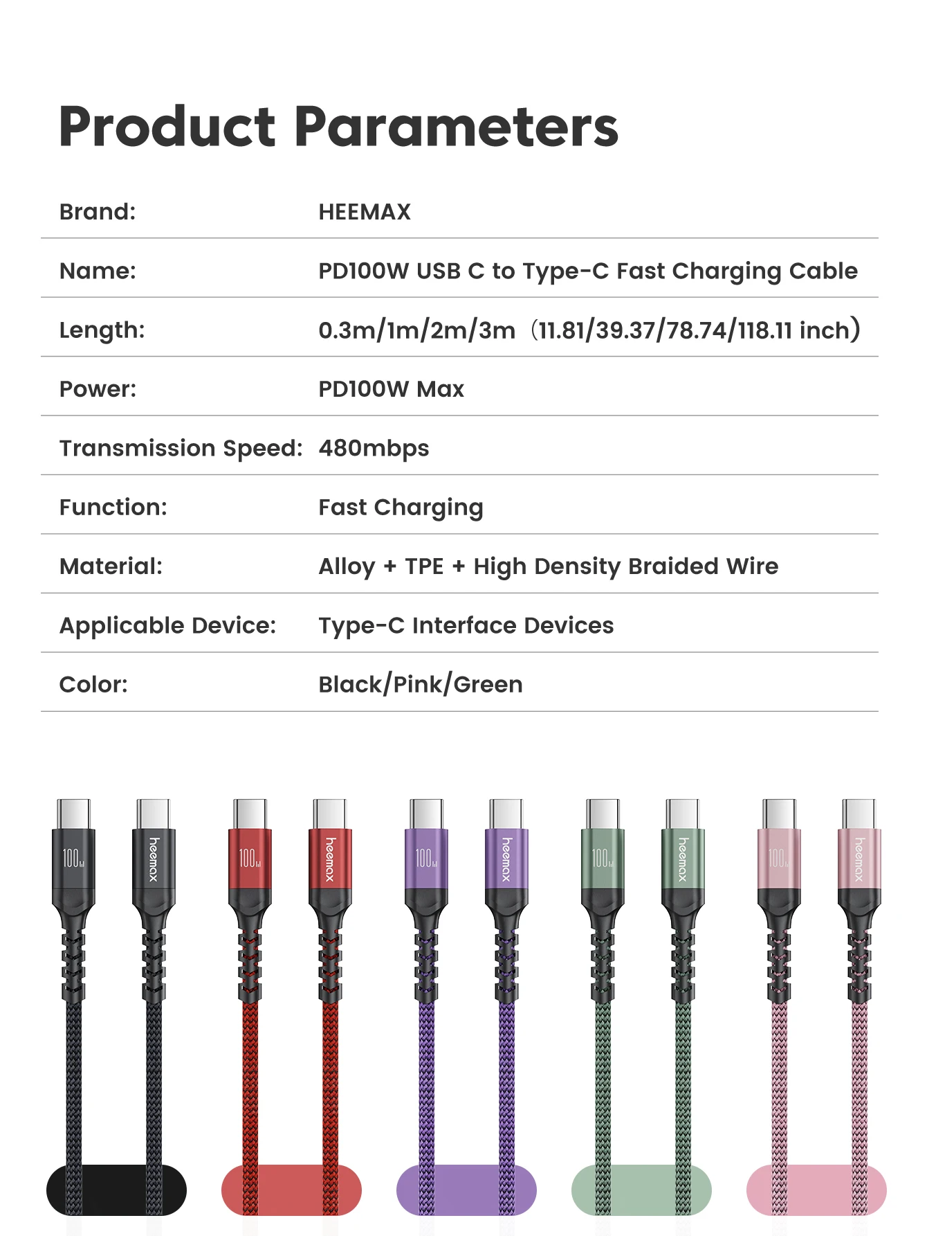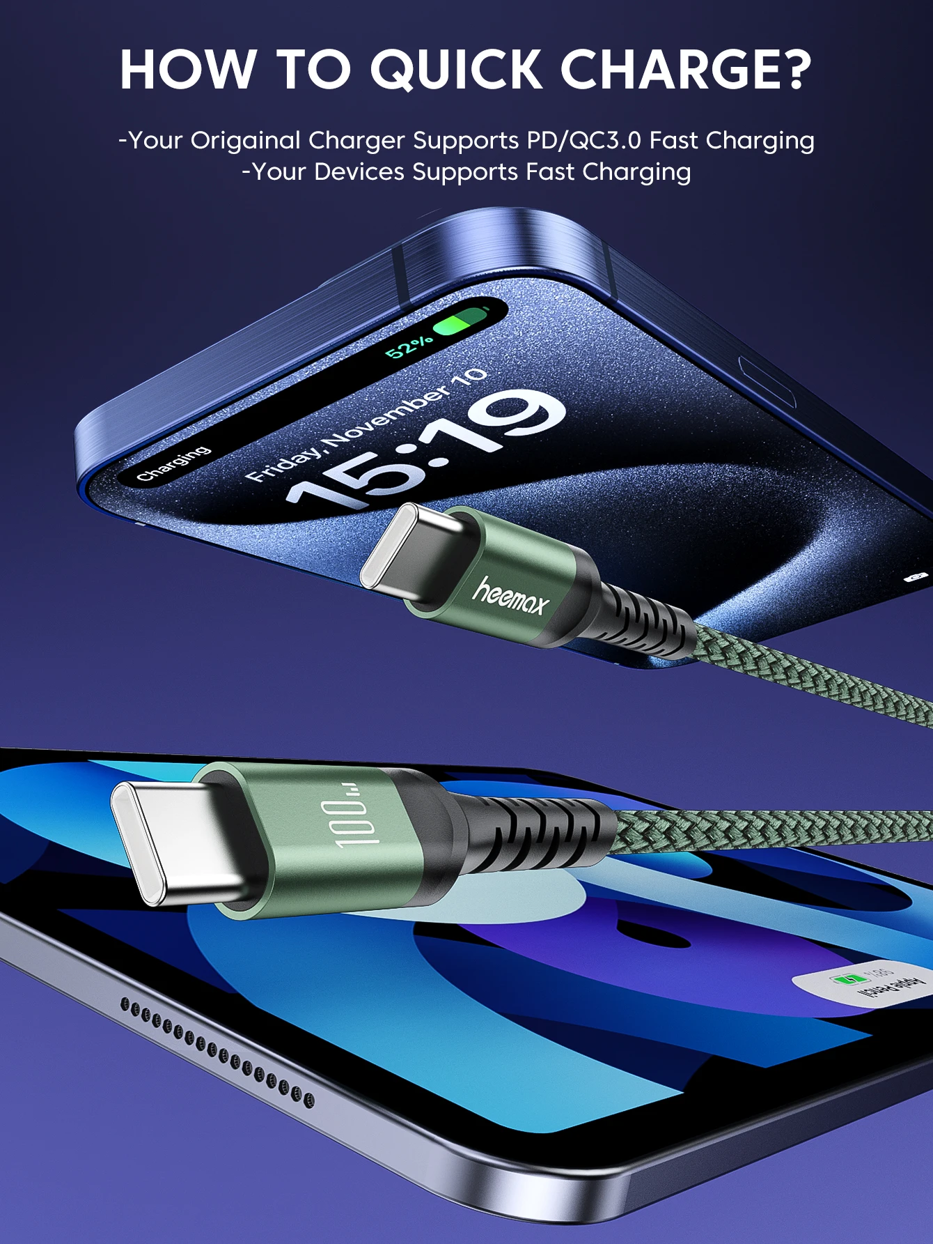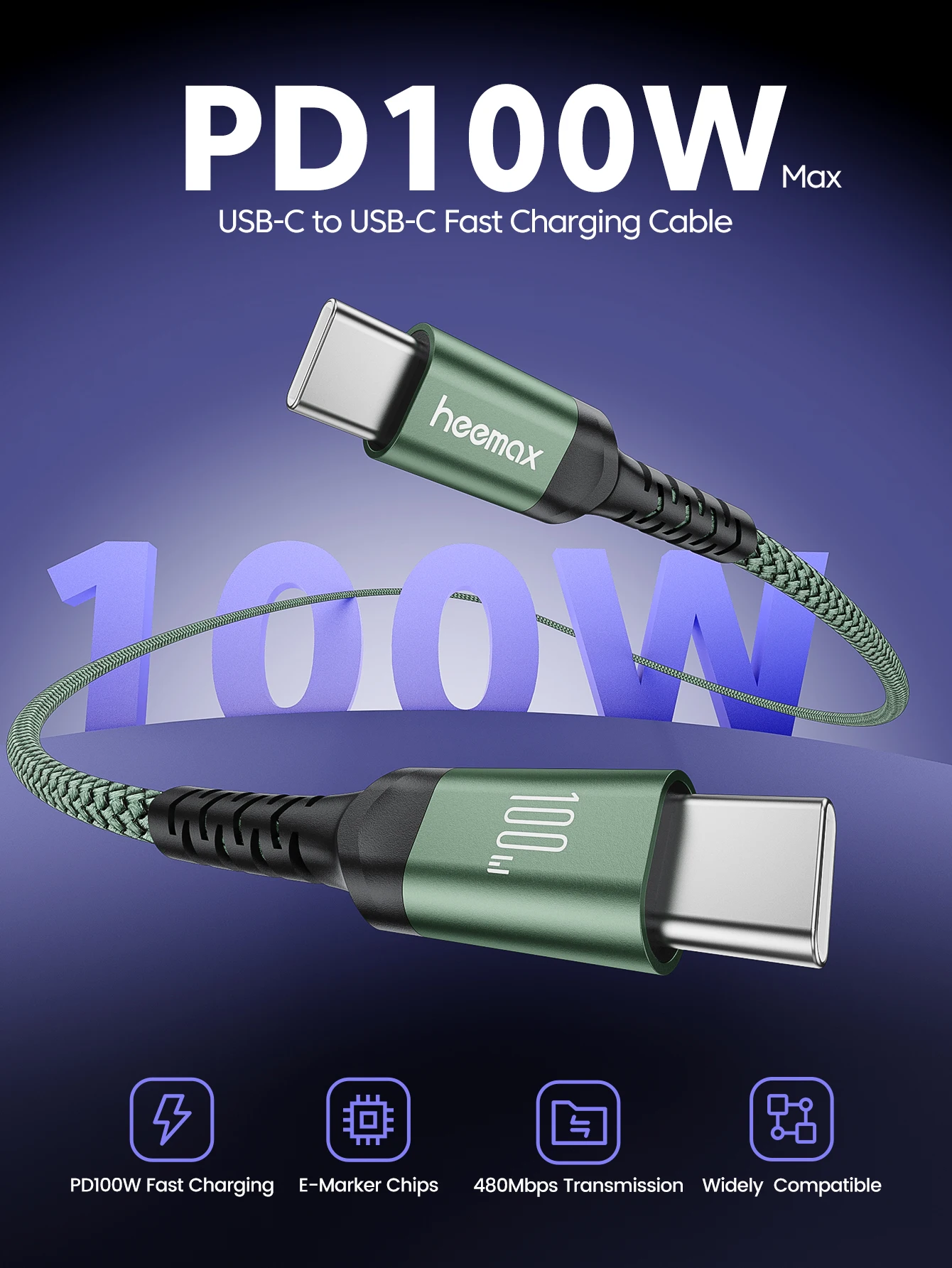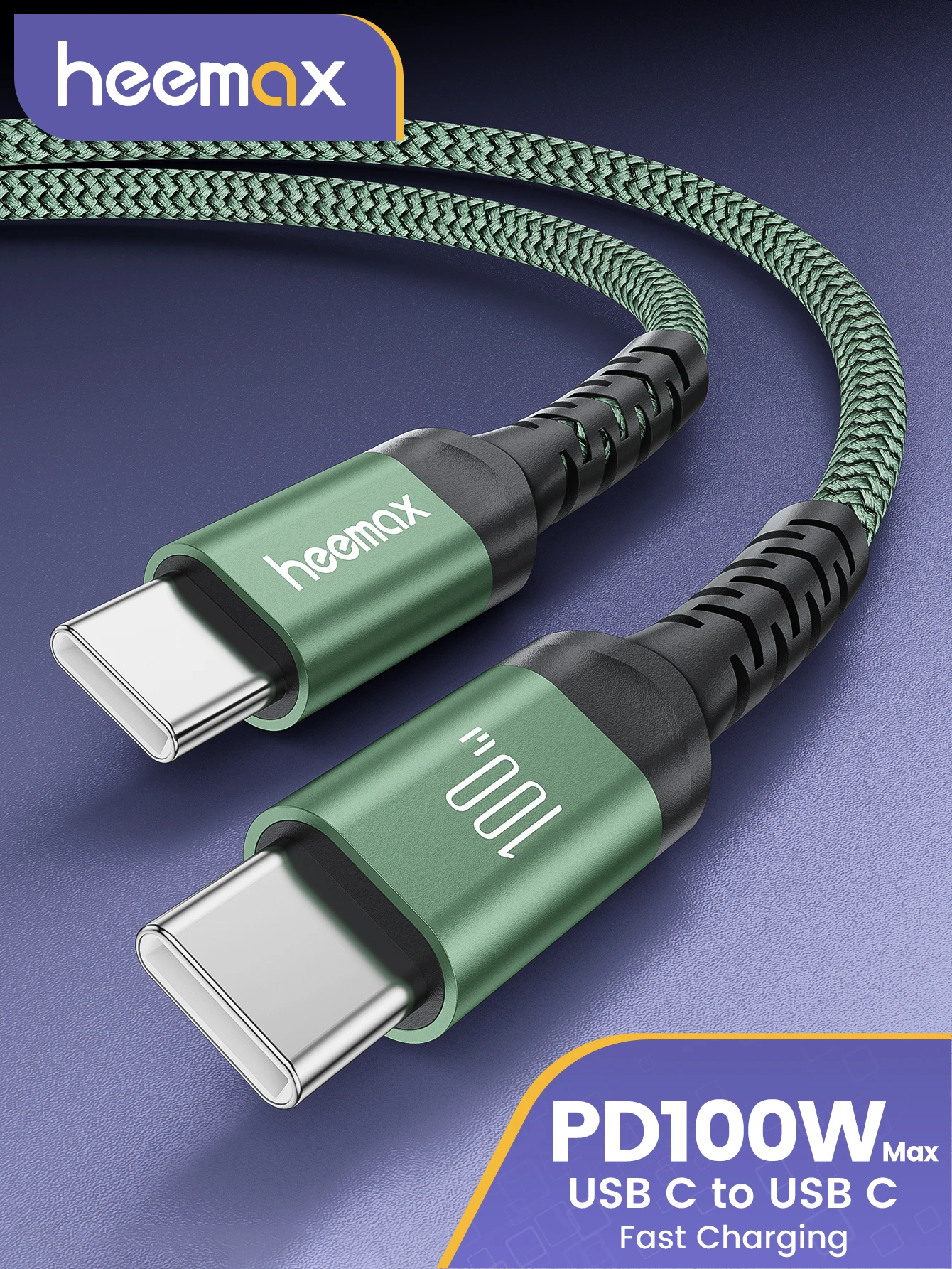 Cable HEEMAX USB C a USB tipo C, admite carga rápida de 100 W (20 V/5 A), carga completa Huawei Mate 20 Pro en 95 minutos, se puede usar para computadora portátil, iPhone 15/16 Pro Max