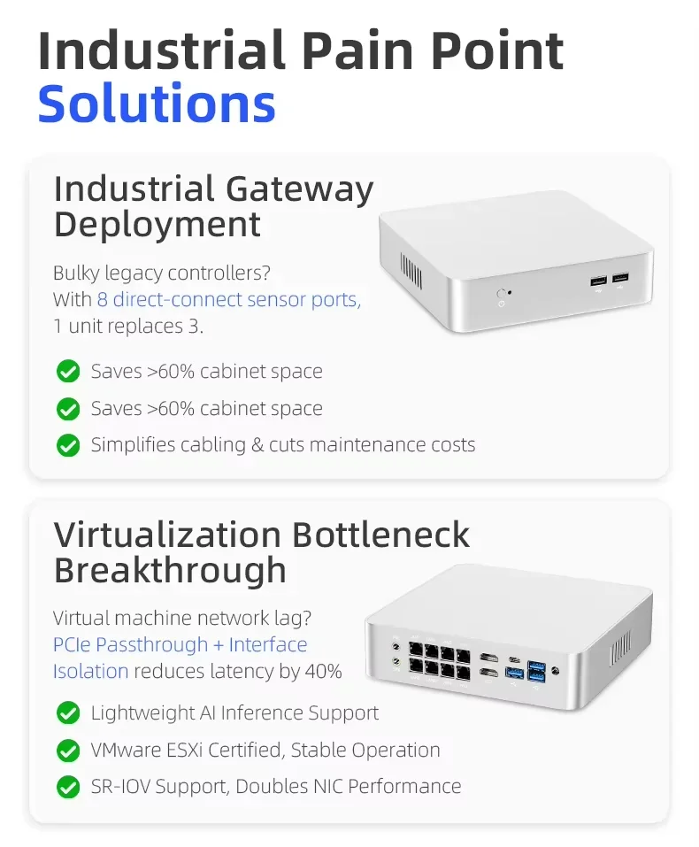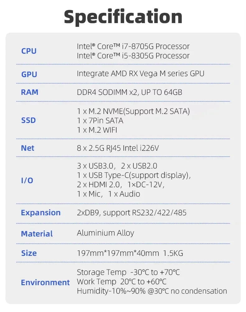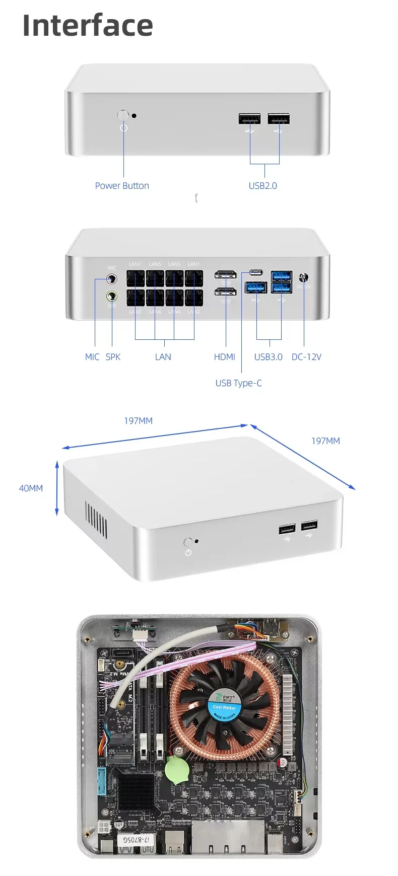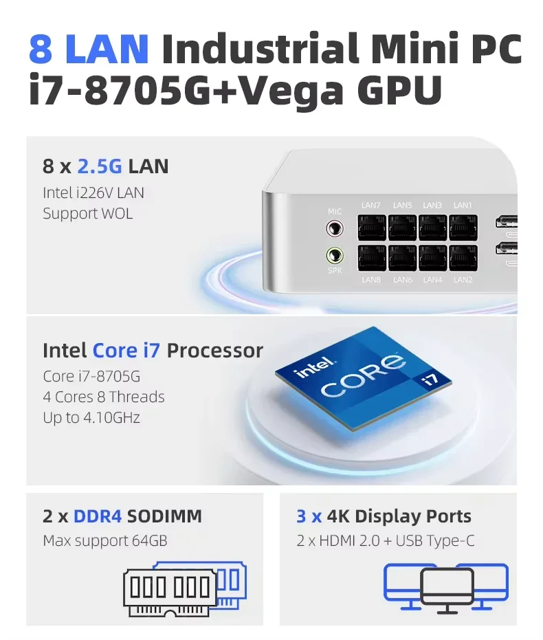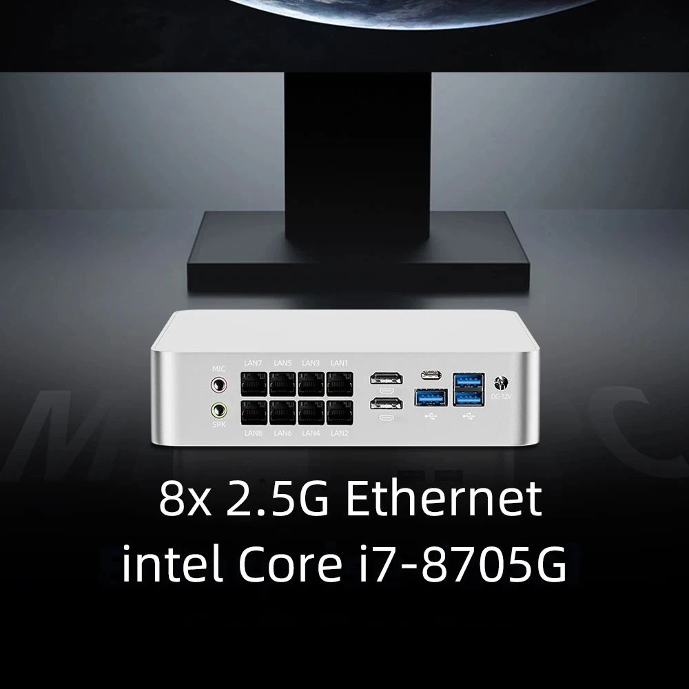 Helorpc Mini PC industrial con soporte de I7-8705G Computadora de escritorio Linux Pfsense con 8xI226V LAN 2xHDMI2.0 3xUSB3.0 1xTYPE-C