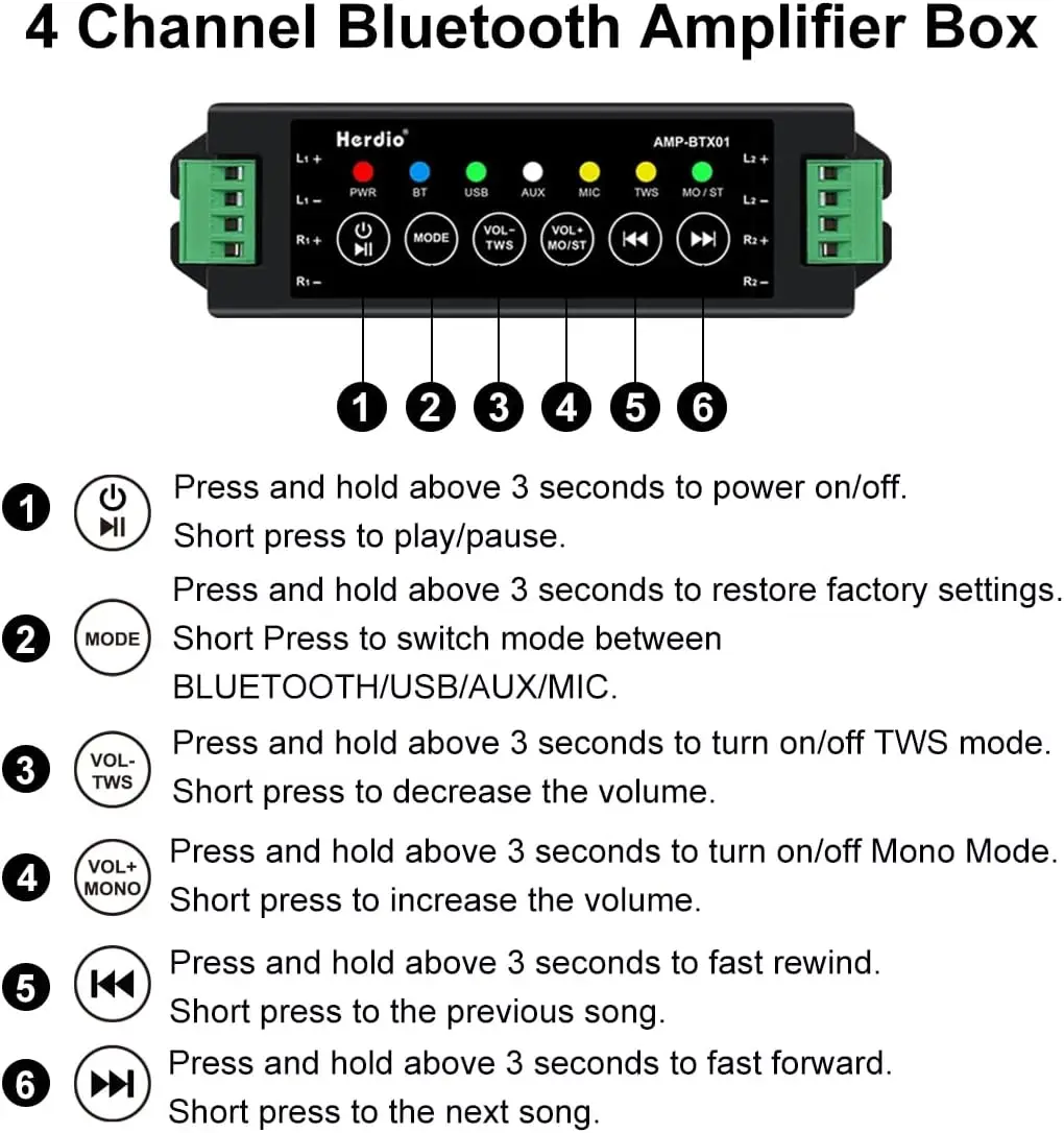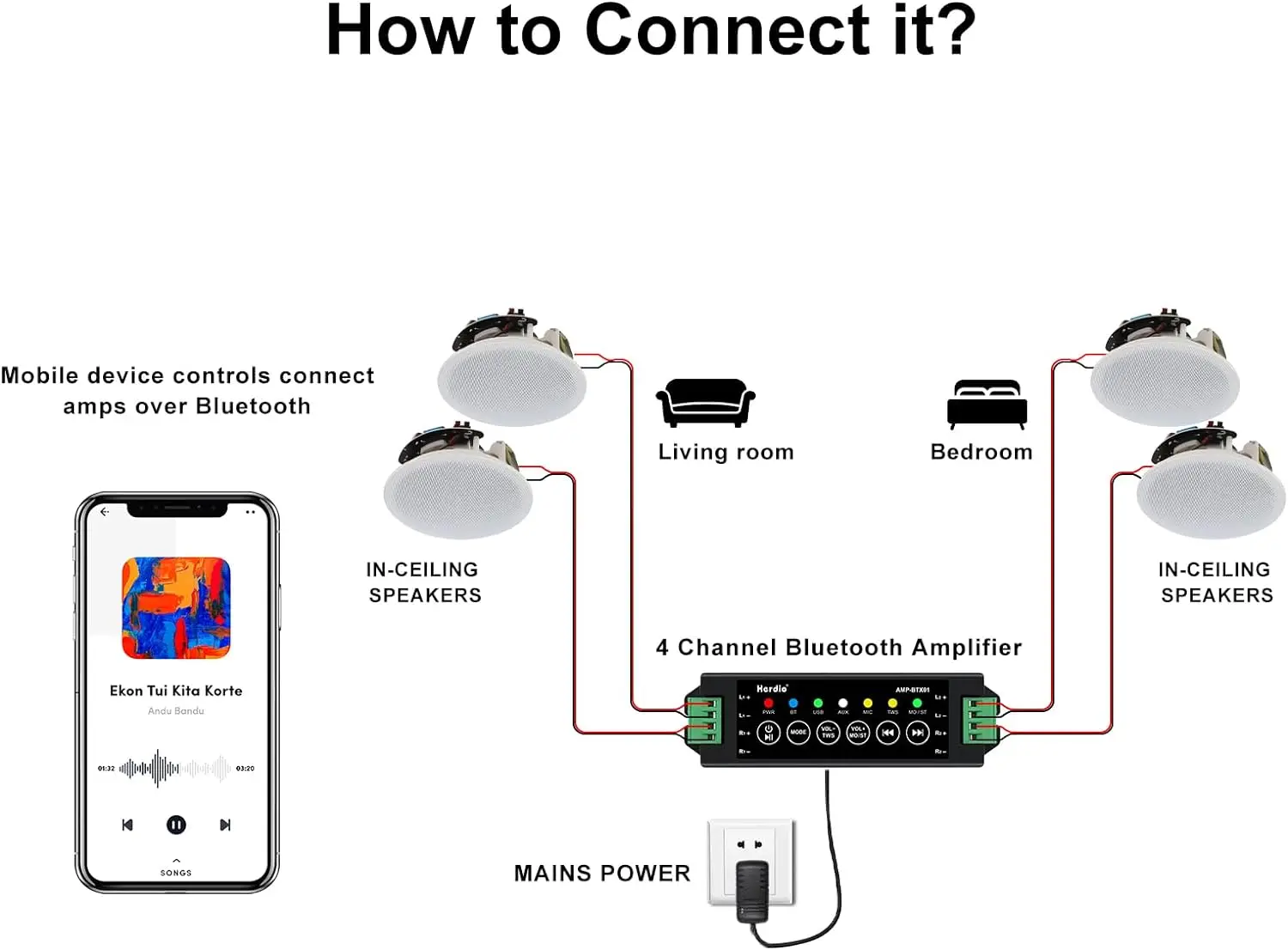 Amplificadores Bluetooth de 4 canales:El amplificador te permite emparejar 4 altavoces para obtener un sonido potente.simple y fácil de usar