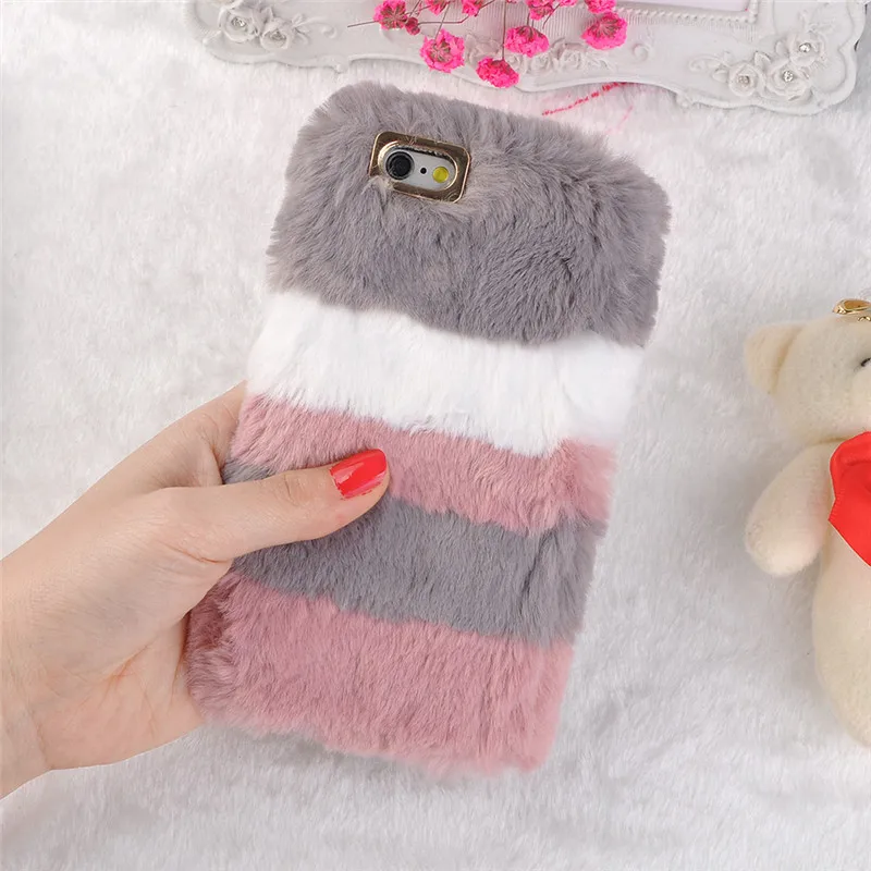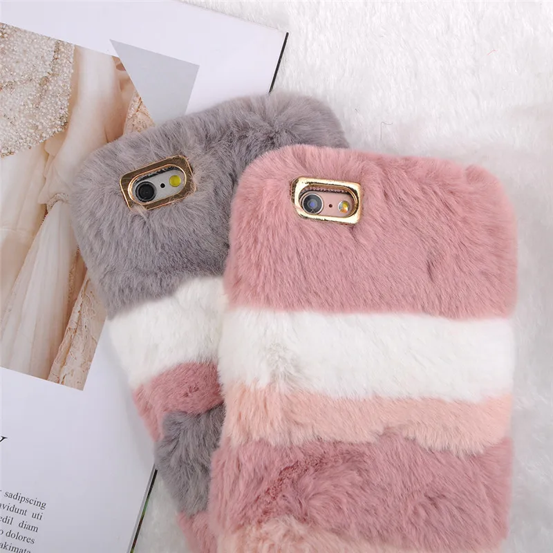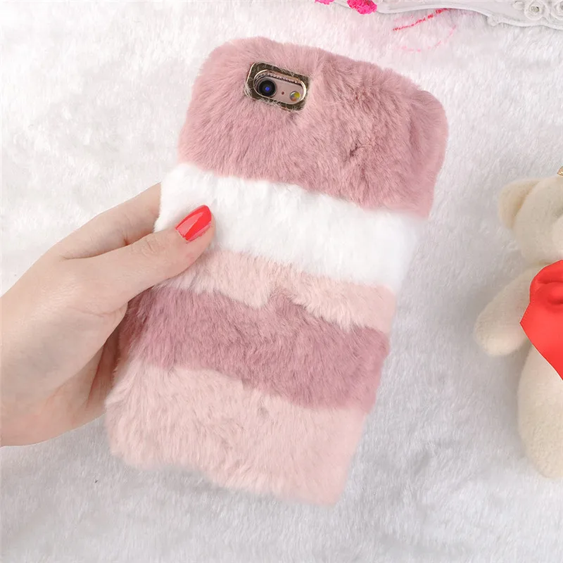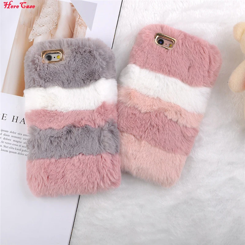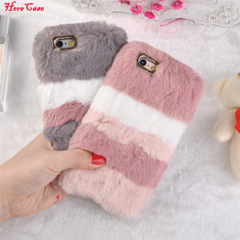 HereCase caliente de peluche de juguete funda de rayas funda para iPhone 8 7 Plus 6 6 s Plus X TPU suave rosa mullida piel Fundas para el iPhone 8 Plus