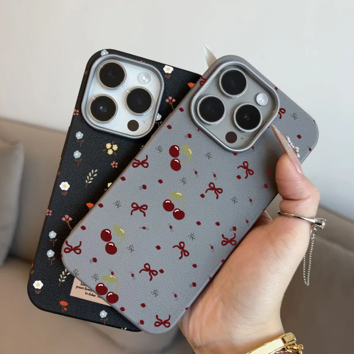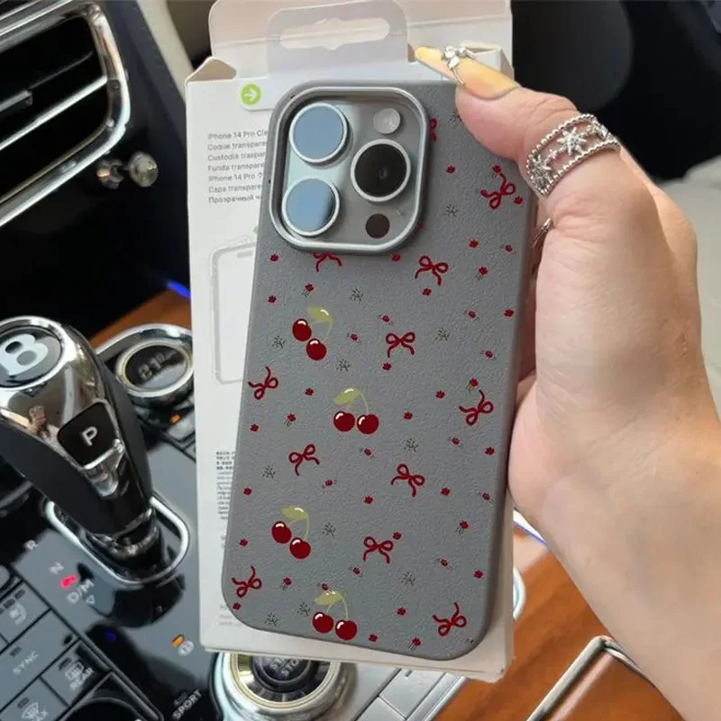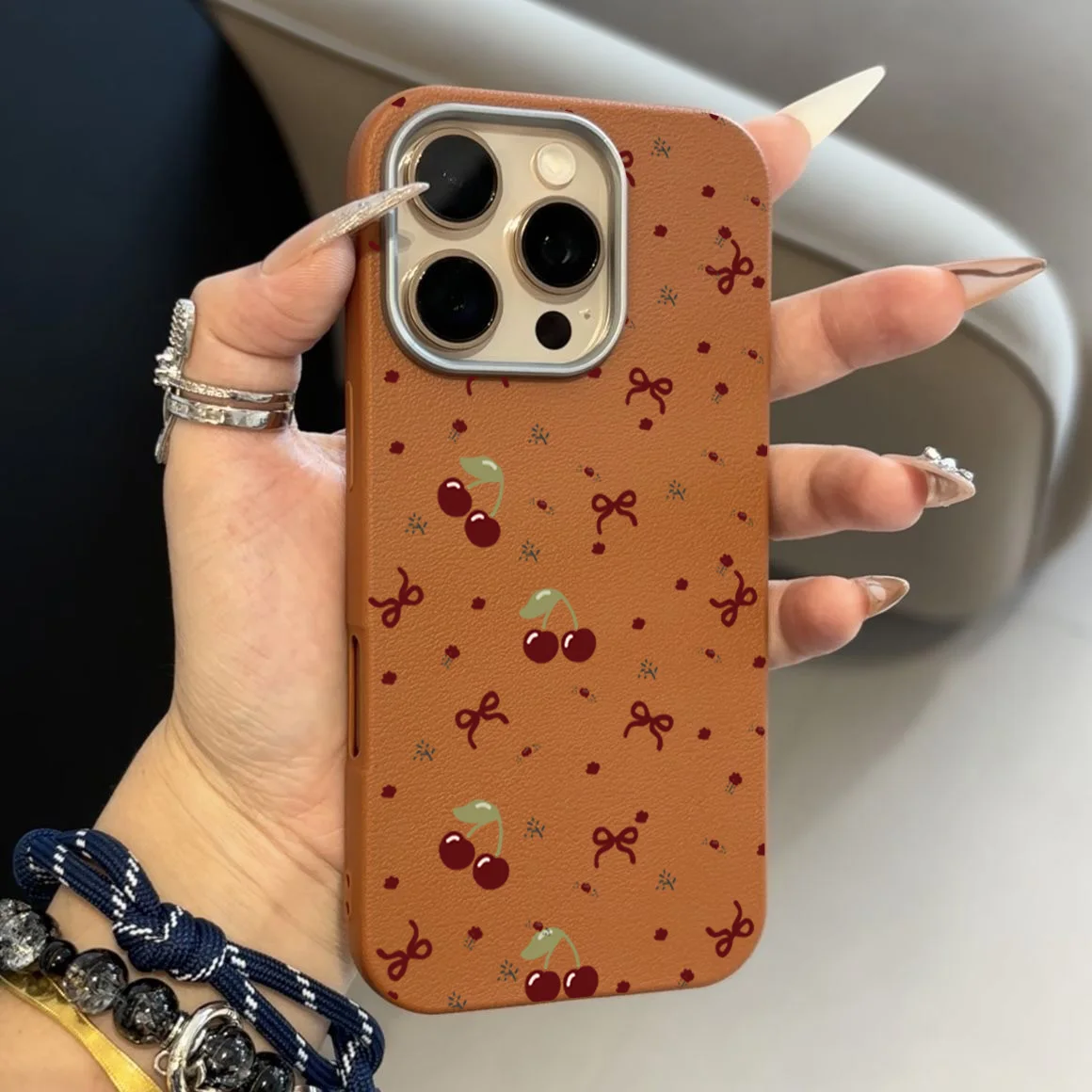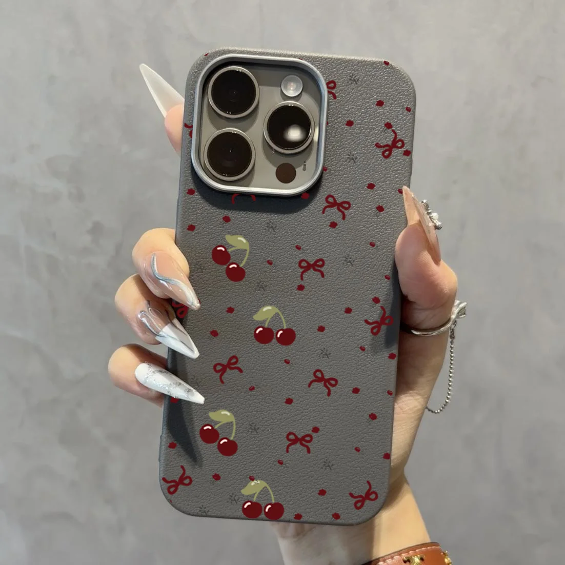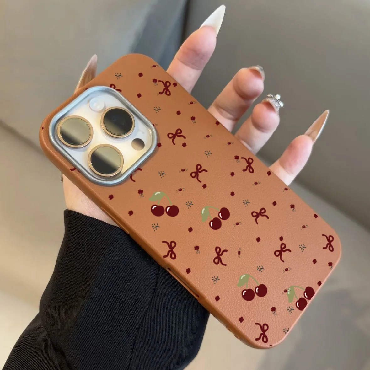 Comprar Hermosa funda de teléfono con diseño de Litchi y lazo de cereza para iPhone 16 15 14 13 12 11 Pro Max XS X XR 7 8 Plus SE2022 cubierta de parachoques de cuero