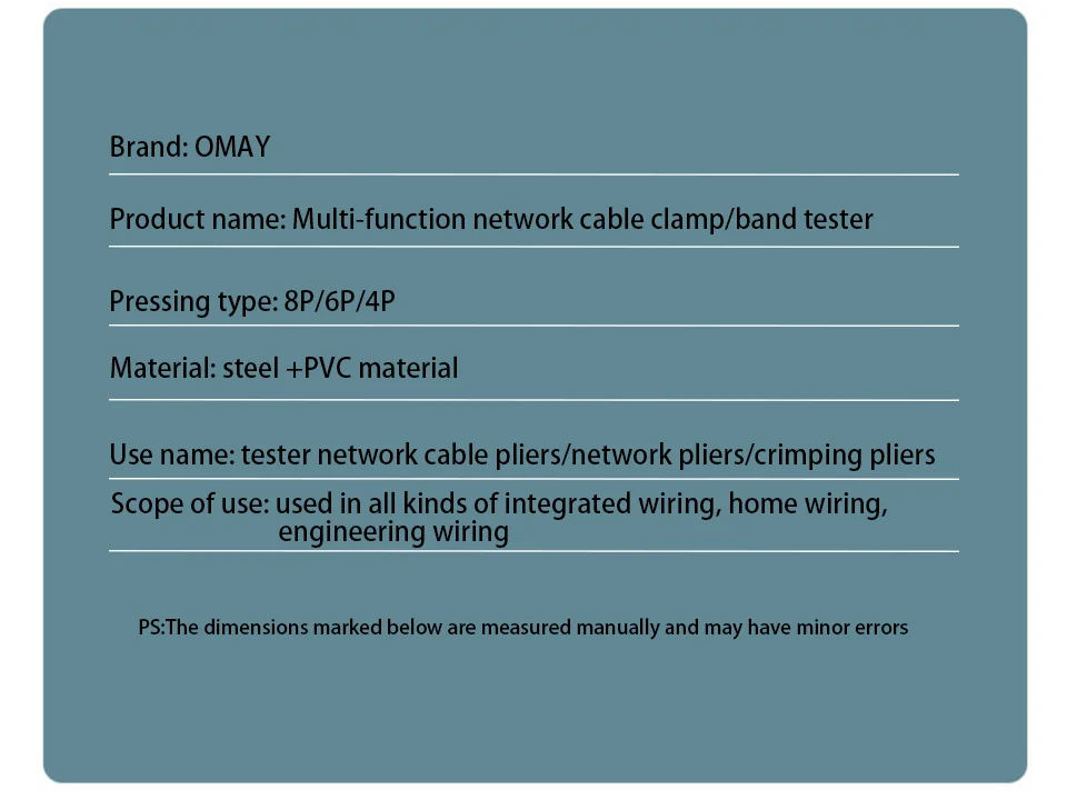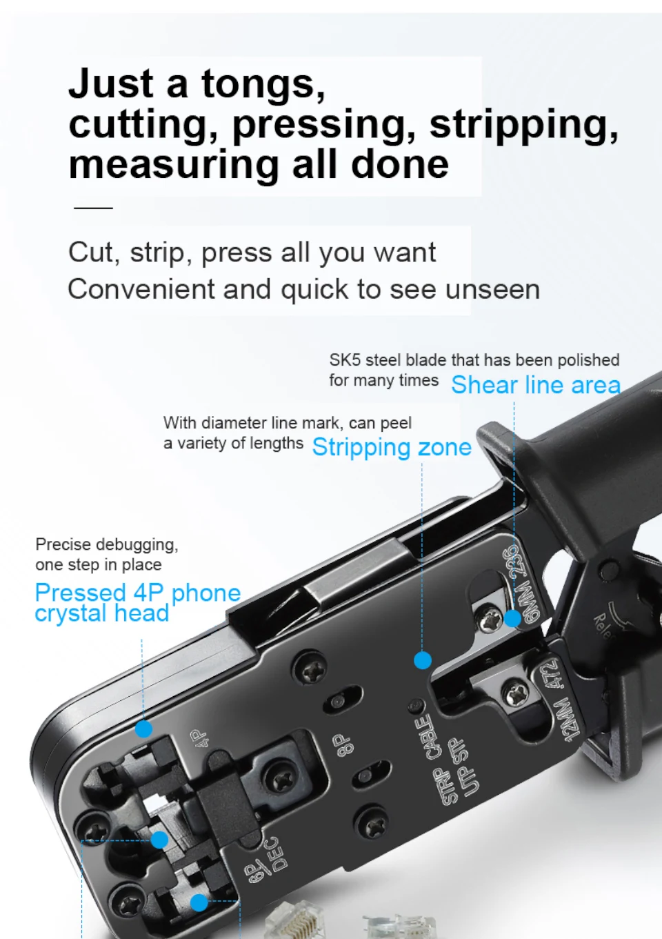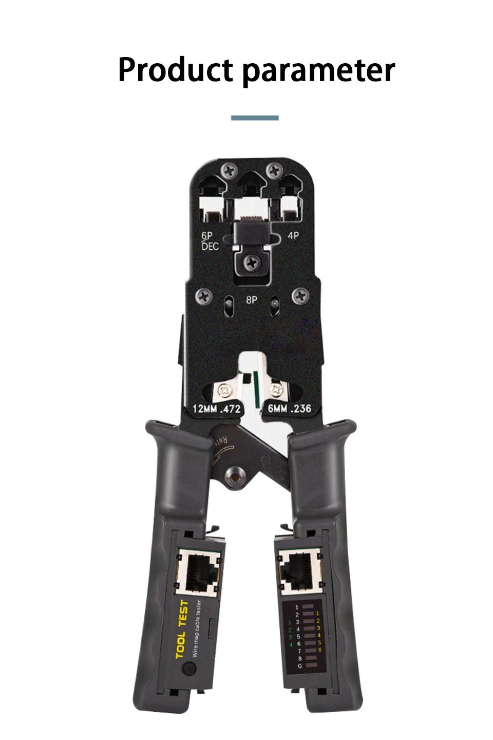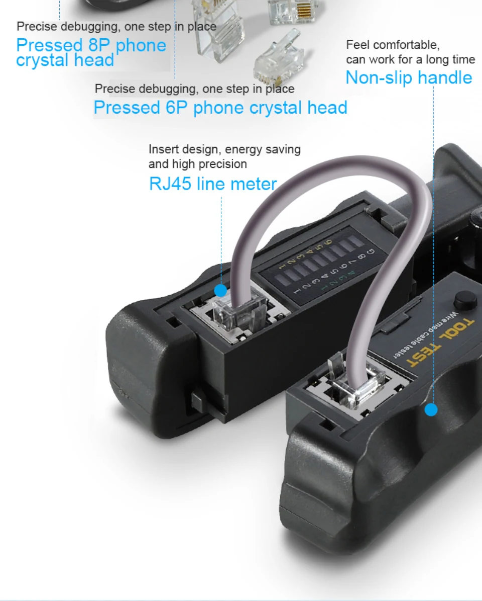 Este producto viene con la ventaja de un probador de cables 6P/8P/4P, que puede completar la prueba de líneas telefónicas, cables de red, etc.Integra el procesamiento de instalación y pruebas, lo que lo hace versátil con una sola abrazadera.