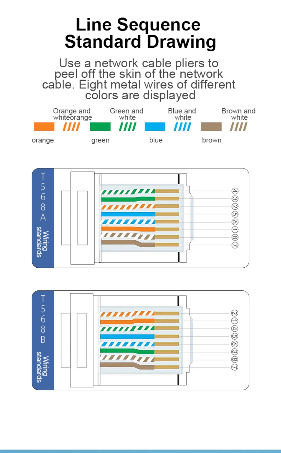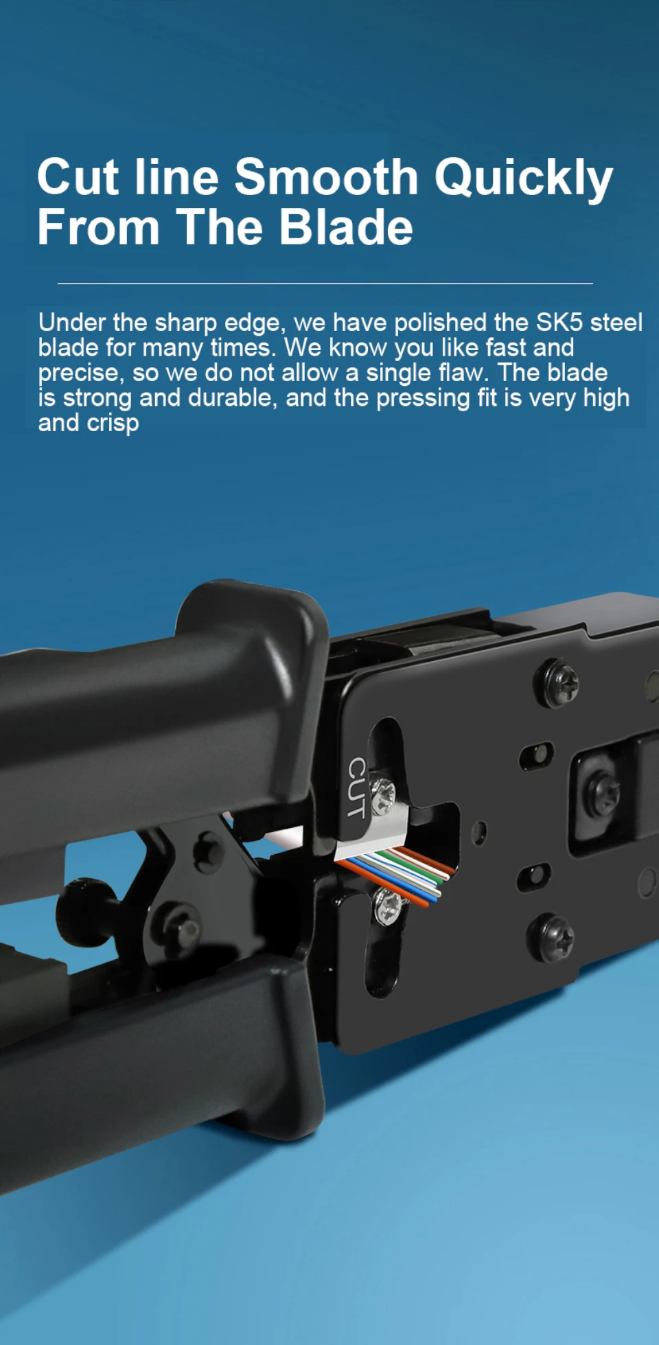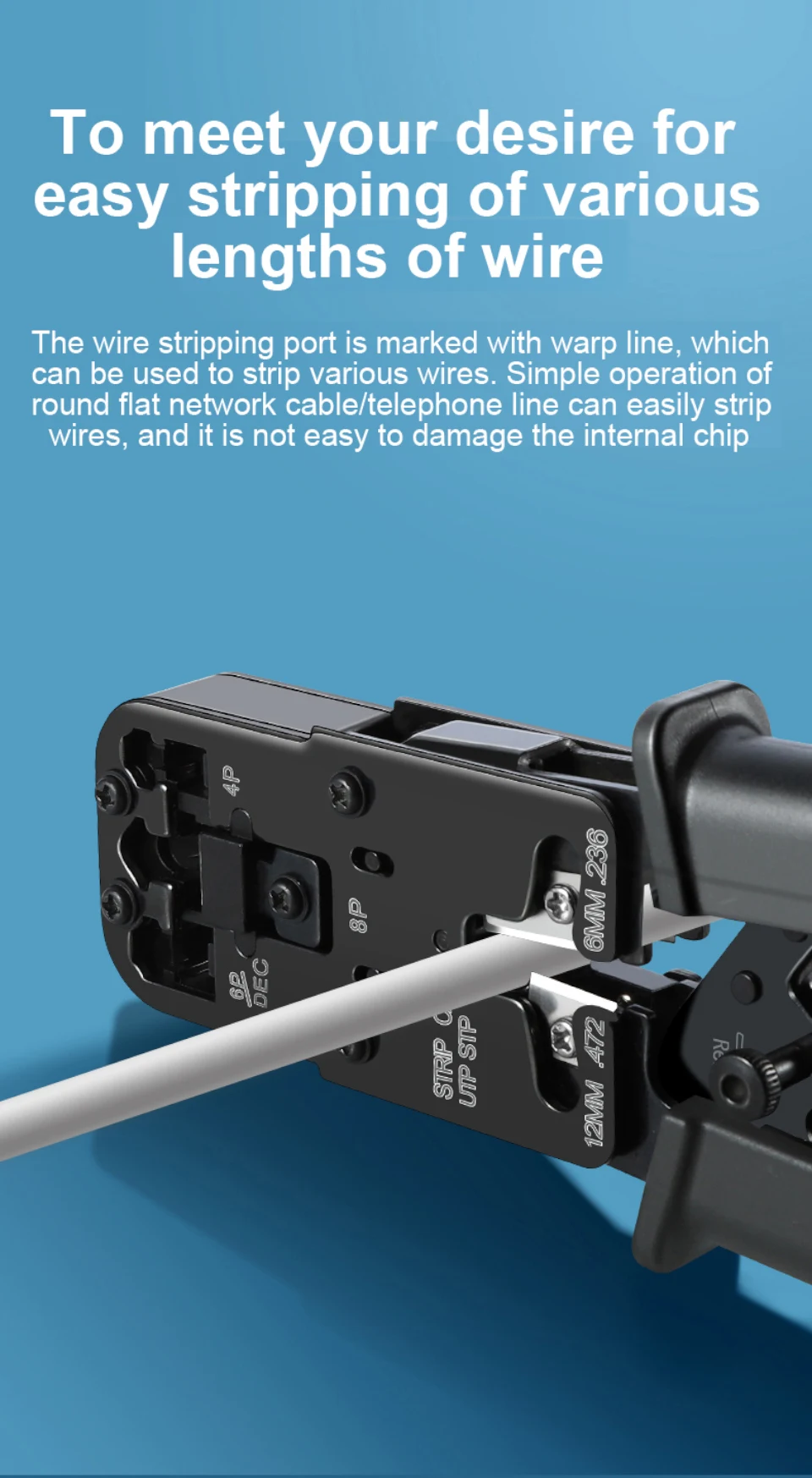 Este producto es adecuado para 6P/8P/4P (conocido como alicates para cables Ethernet 3 en 1) y es más adecuado para engarzar cabezales de cristal RJ45 sin orificio pasante.También se puede utilizar el cabezal de cristal de orificio pasante y la instalación de cabezales de conector RJ45 sin orificio pasante se puede completar reservando la longitud del cable Ethernet.