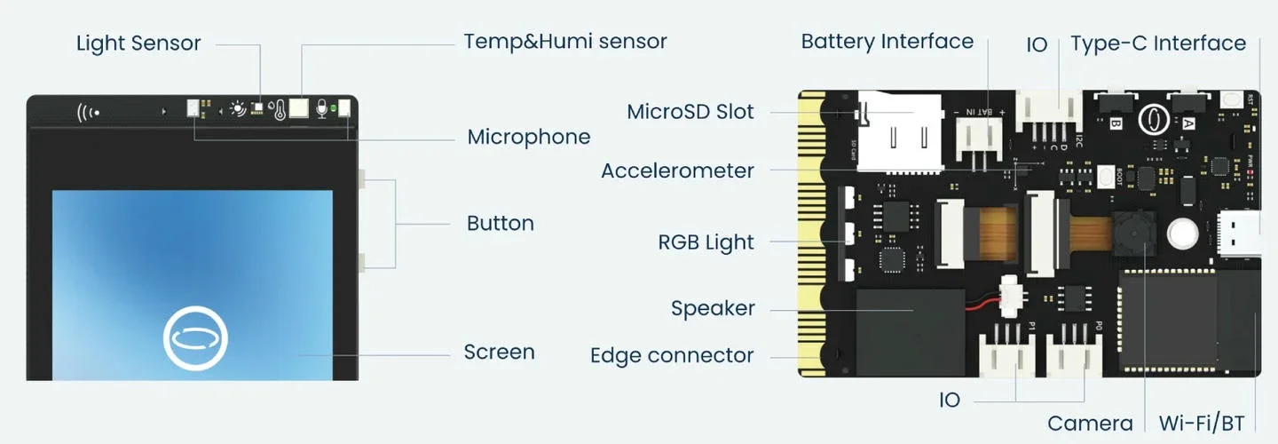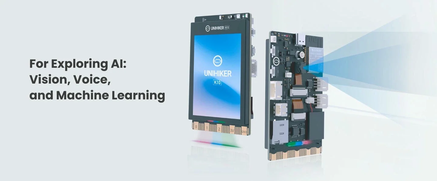 UNIHIKER K10 es un dispositivo de aprendizaje de IA diseñado para la educación.Integra una pantalla a color de 2,8 pulgadas, Wi-Fi y Bluetooth, una cámara, micrófono, altavoz, luz RGB, sensor de temperatura, sensor de humedad, sensor de luz y acelerómetro.También cuenta con conectores de borde e interfaces Gravity IO, lo que permite la conexión y el control de varios sensores y actuadores digitales, analógicos, I2C y UART.