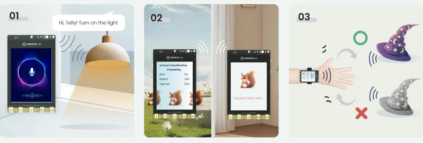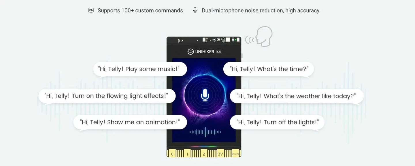 Equipado con un micrófono incorporado y modelos de voz preinstalados, el UNIHIKER K10 admite el reconocimiento de voz fuera de línea.Esto permite a los usuarios crear aplicaciones activadas por voz, como comandos de voz personalizados y sistemas de IA interactivos, sin necesidad de una conexión a Internet.