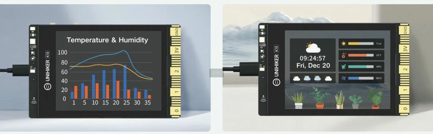 El UNIHIKER K10 está diseñado teniendo en cuenta las aplicaciones de IoT.Admite recopilación de datos a largo plazo y monitoreo remoto, lo que lo hace ideal para proyectos que requieren grabación y análisis continuos de datos.Con su rico conjunto de sensores (temperatura, humedad, luz, acelerómetro) y opciones de conectividad (Wi-Fi, Bluetooth), los usuarios pueden integrar fácilmente UNIHIKER K10 en ecosistemas de IoT para monitoreo en tiempo real, control remoto de dispositivos y datos. aplicaciones basadas.