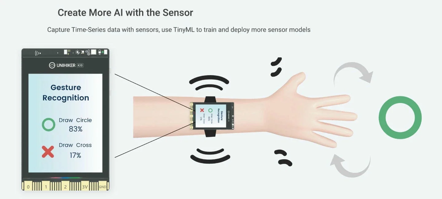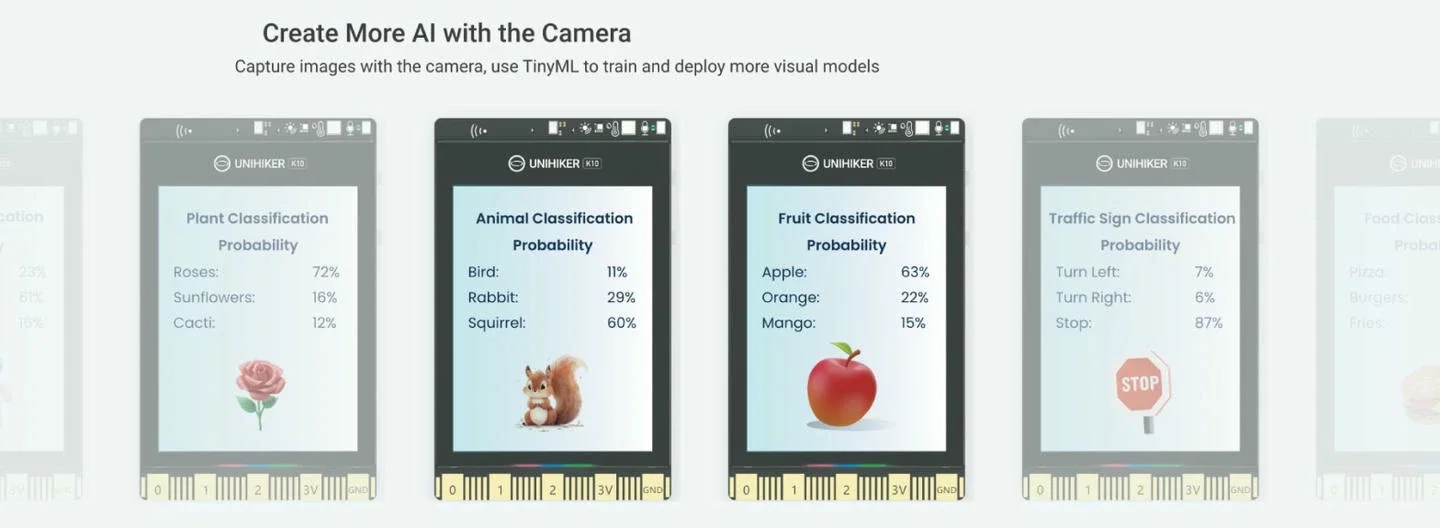 El UNIHIKER K10 es compatible con TinyML, lo que permite a los usuarios entrenar sus propios modelos de sensores y visión personalizados.Con la capacidad de desarrollar modelos de IA personalizados para tareas específicas, los usuarios pueden explorar aplicaciones de IA más profundas y adaptar la funcionalidad del dispositivo a sus proyectos únicos.Ya sea que trabaje con reconocimiento de imágenes, datos de sensores u otras tareas basadas en IA, TinyML ofrece la flexibilidad de superar los límites de las capacidades del dispositivo.