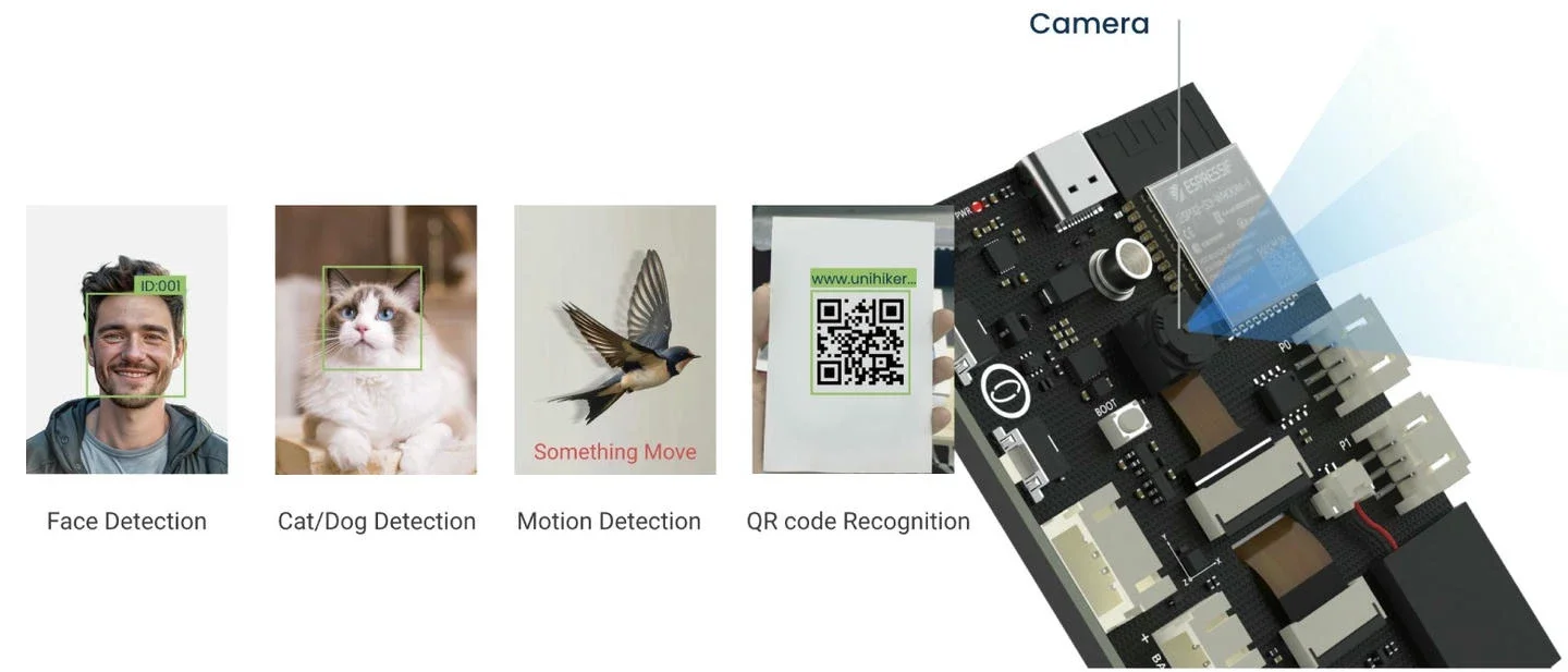 El UNIHIKER K10 viene preinstalado con cuatro potentes modelos de IA de visión: detección de rostros, detección de gatos/perros, reconocimiento de códigos QR y detección de movimiento.La cámara integrada de 2MP, combinada con estos modelos, permite a los usuarios comenzar rápidamente a explorar aplicaciones de IA.