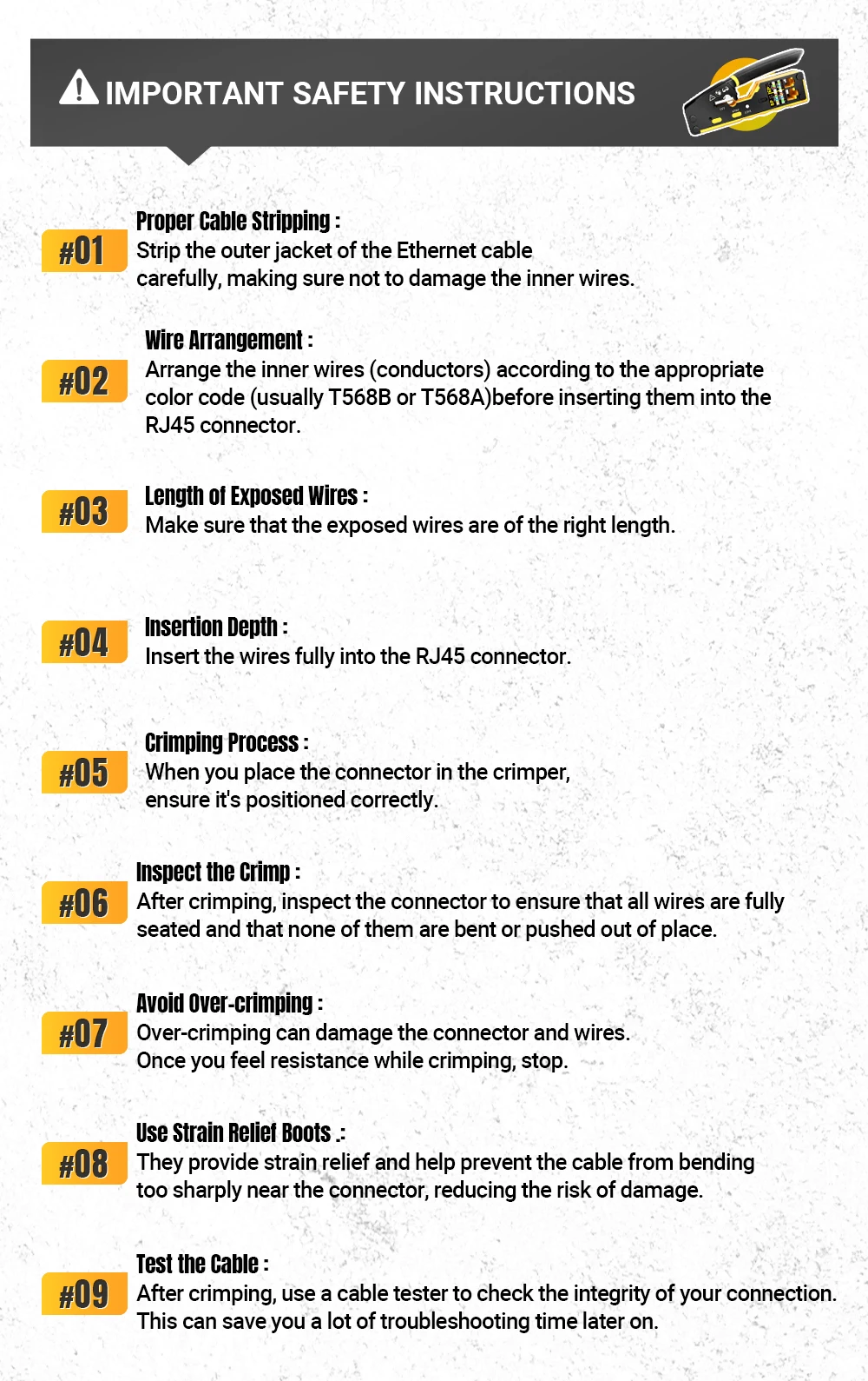 9. TEs el cable:Después de engarzar, use un probador de cables para verificar la integridad de su conexión. Esto puede ahorrarle mucho tiempo de solución de problemas más adelante.