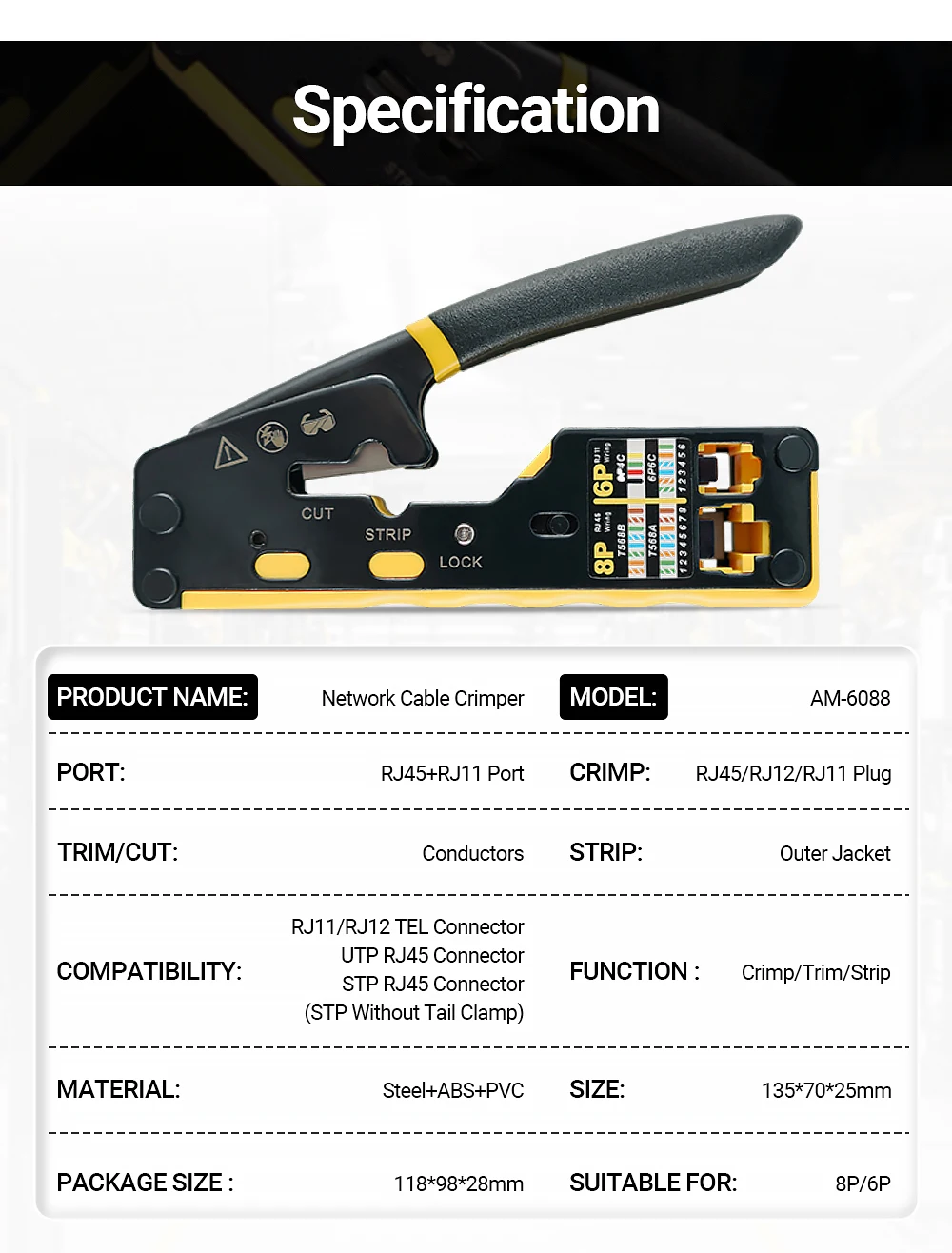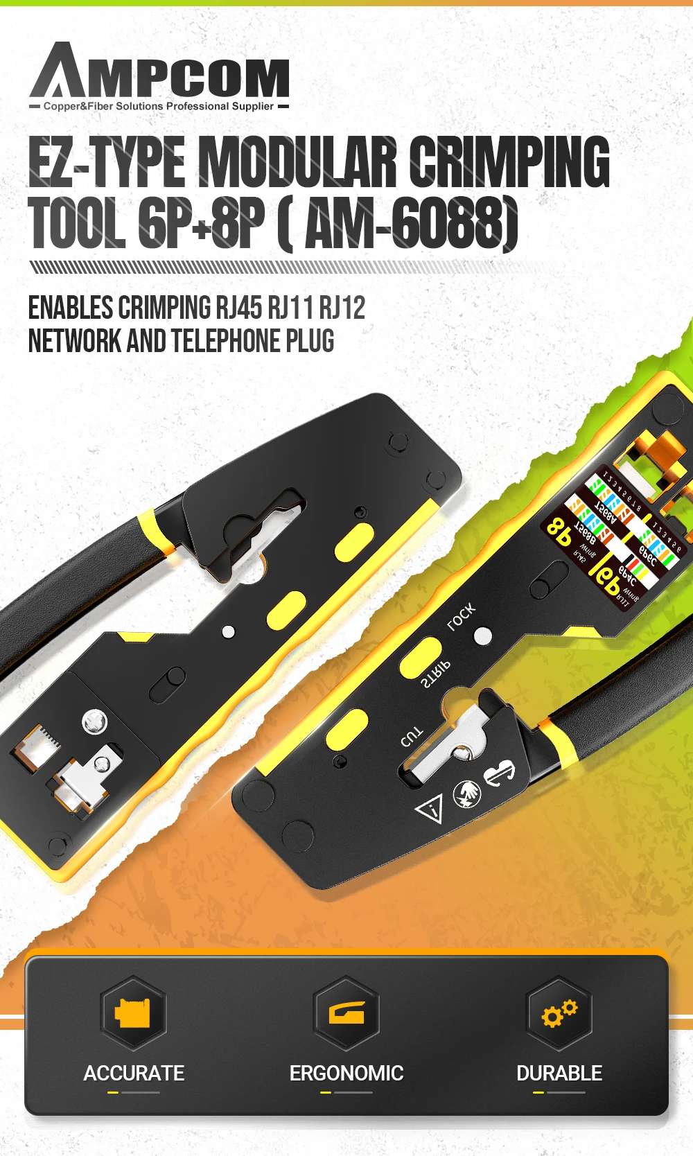 Esta alta calidadHerramienta AM-60888 DE LA EZ-encrespadura DE LA RED RJ45Está hecho de materiales duraderos,Enfatizar la precisiónDe cada engarzado modular. También, esCómodo de sostener y fácil de usarPor períodos prolongados. Este mango ergonómico con agarres antideslizantes, reduciendo la tensión en las manos y asegurando crimps precisos sin molestias.