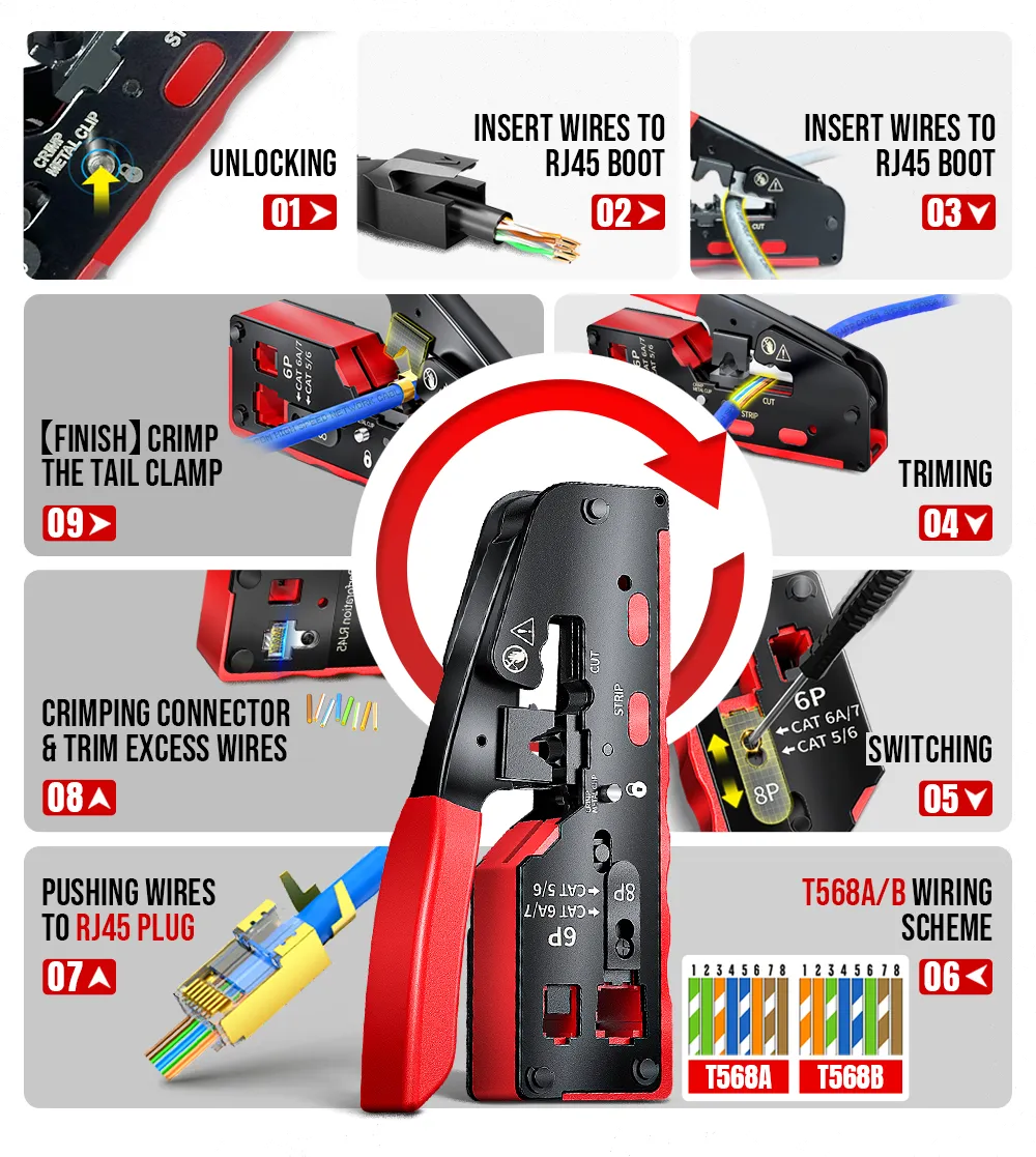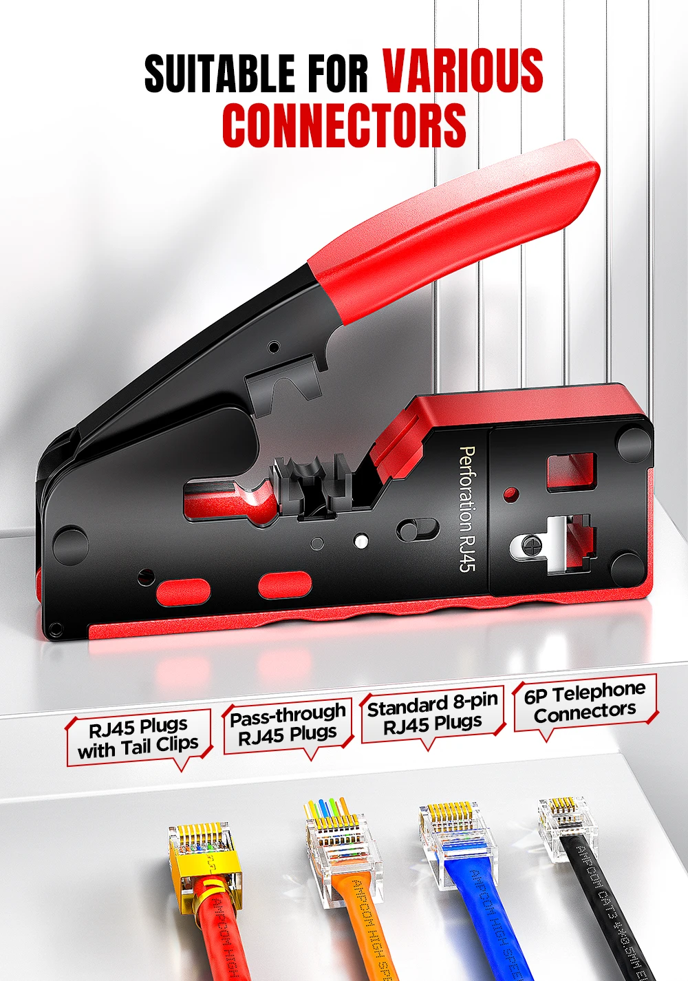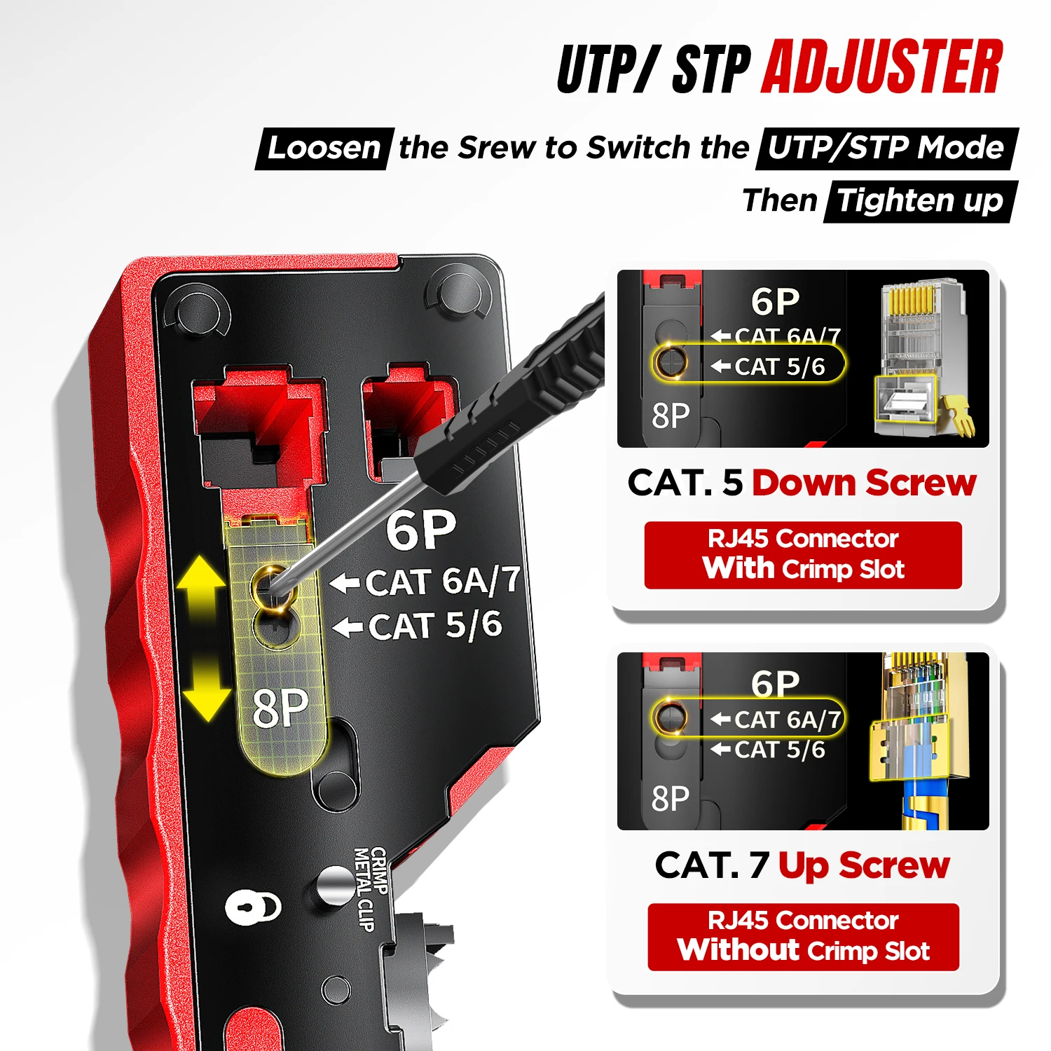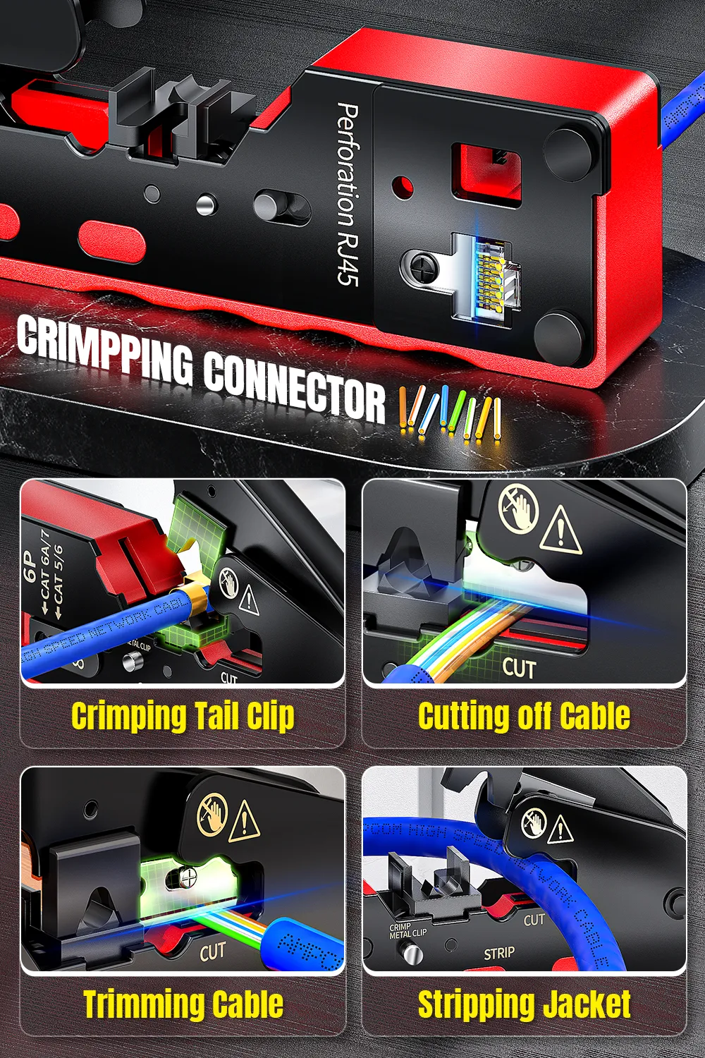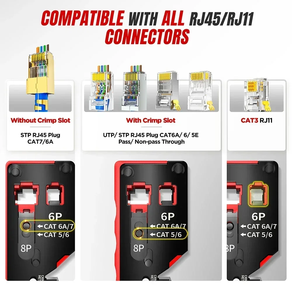 Aplicación:Adecuado para RJ45 estándar/paso y RJ12 RJ11Conector,Admite cables Ethernet STP/UTP Cat5 Cat5e Cat6