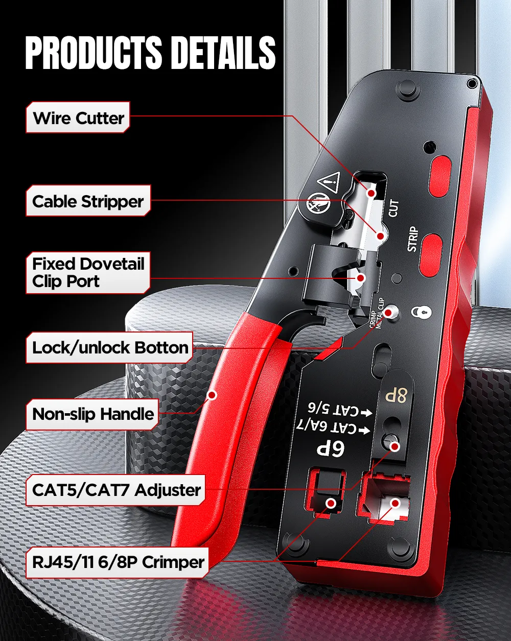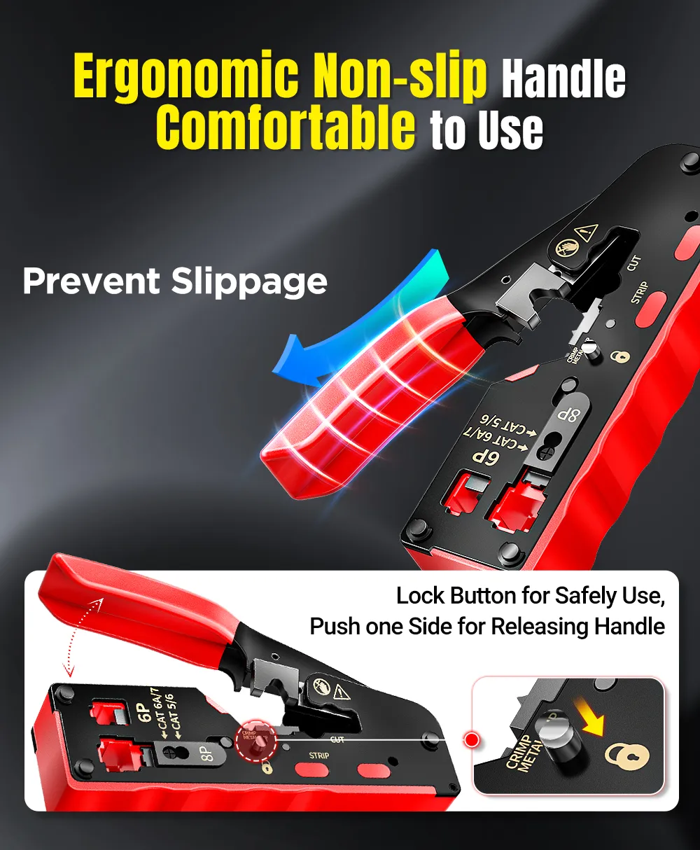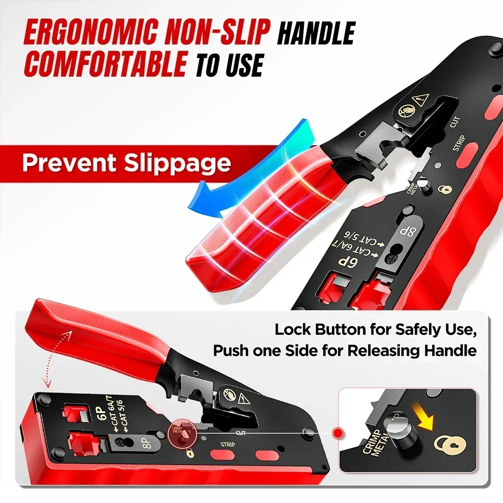 Cortador de alambre, pelacables, puerto de clip de cola de milano fijo, botón de bloqueo/desbloqueo, engarzado, mango antideslizante, ajustador CAT5/CAT7, engarzador RJ45/11 6/8P