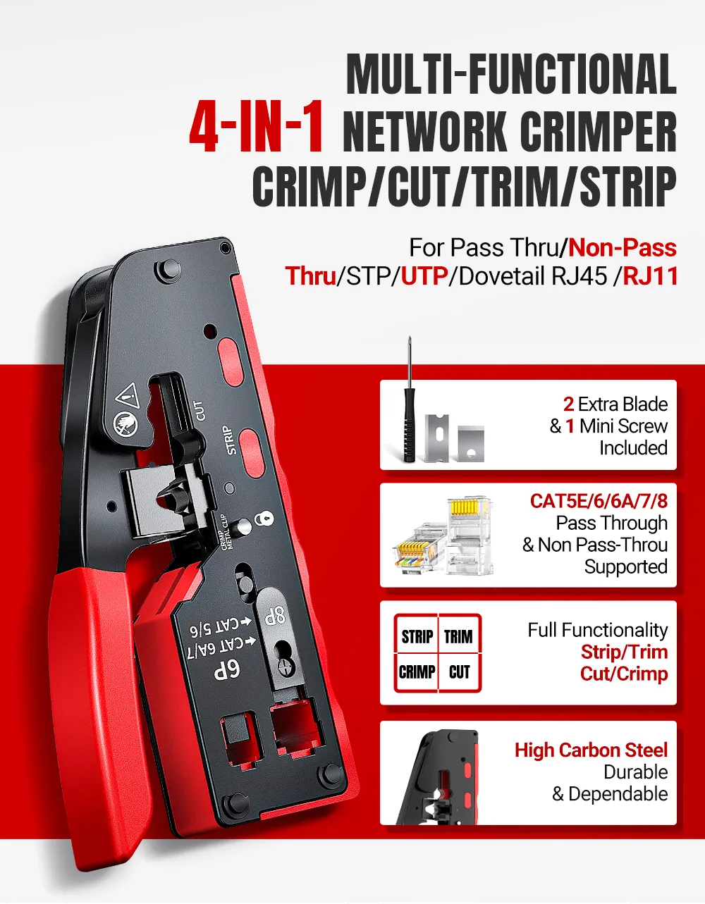 Comprar Herramienta de prensado de red AMPCOM Cat 7, herramienta de prensado/recorte/trim/tira 4 en 1, funciona con todos los conectores RJ45/RJ11, herramienta de prensado con dos hojas