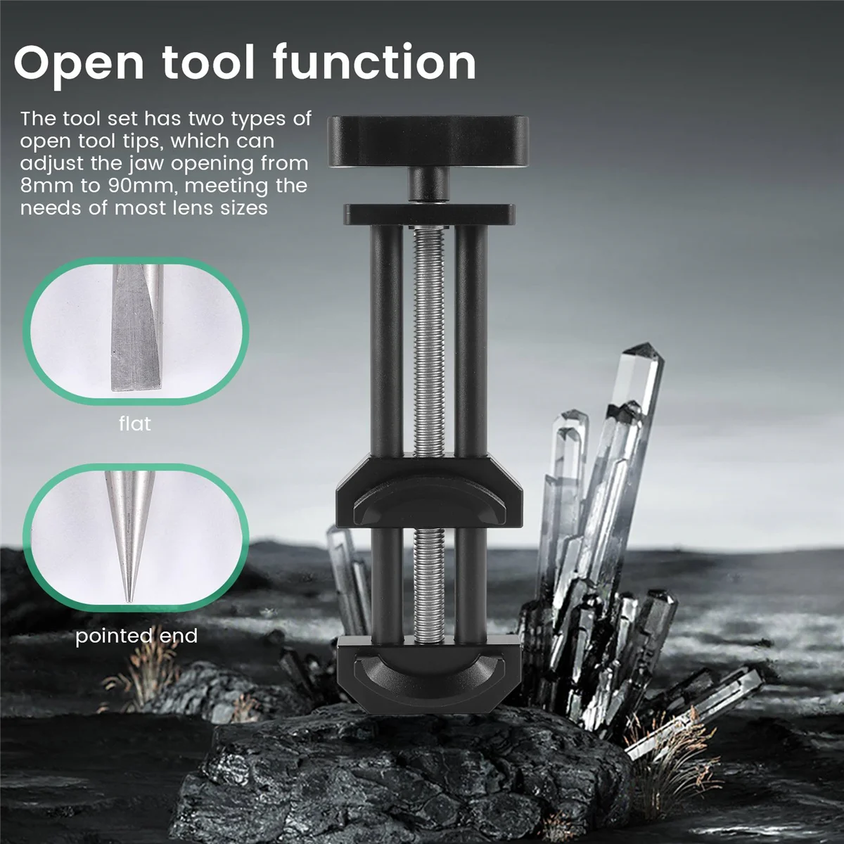 Características: Función de herramienta abierta: el juego de herramientas tiene 2 tipos de puntas para herramientas abiertas, apertura de mandíbula ajustable de 8 mm a 90 mm, satisface las necesidades de la mayoría de los tamaños de lentes. Plana y puntiaguda (especialmente diseñada para lentes pequeñas).