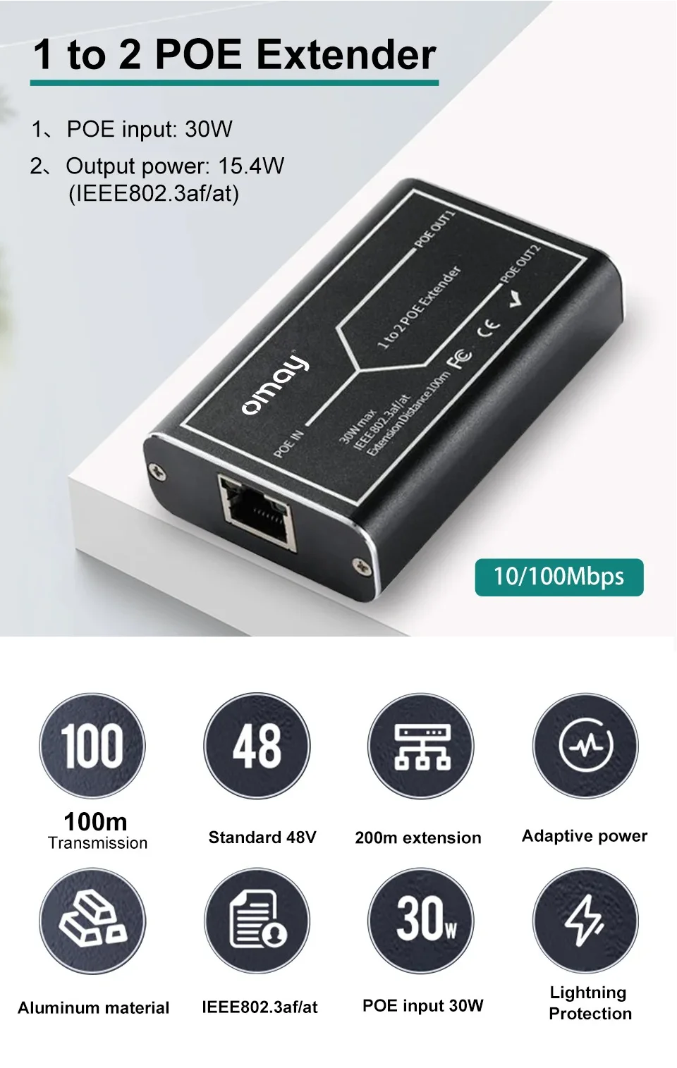Herramientas extensoras POE de puerto de 1 a 2, función de protección contra rayos IEEE 802.3af/at estándar de 48 V para cámara IP NVR POE Extiende 100 metros Ventaja: