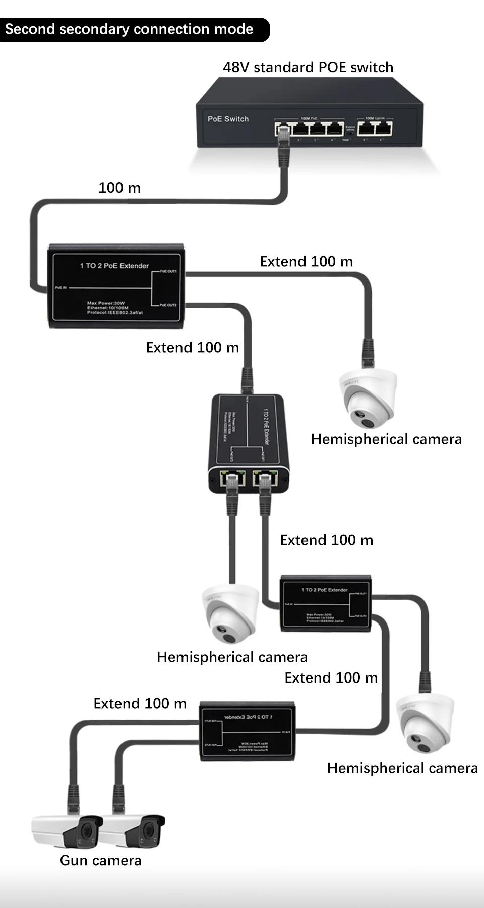 7.El POE estándar se puede dividir en dos capas y en cascada varias veces, con cada capa que transmite ≤ 100 metros.
