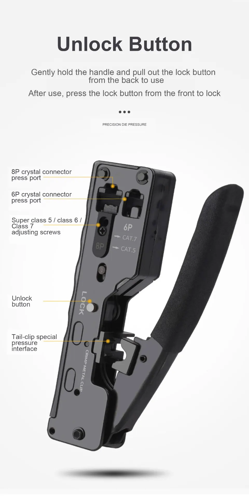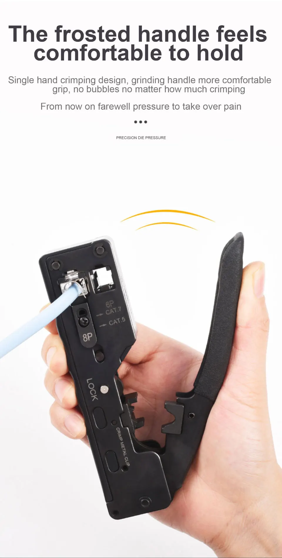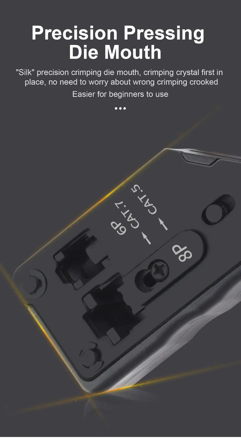 Construido para conectores de red blindados: engarza las cavidades de matriz fija RJ45 (datos) y RJ12 RJ11 (voz), admite cables Ethernet Cat5 Cat5 Cat5e Cat5e Cat6 STP/UTP, pares trenzados, engarzado de cables de teléfono, voz y datos.Diseño especial para conectores blindados Cat6a Cat7 e incluso engarzar el clip de metal en los enchufes.