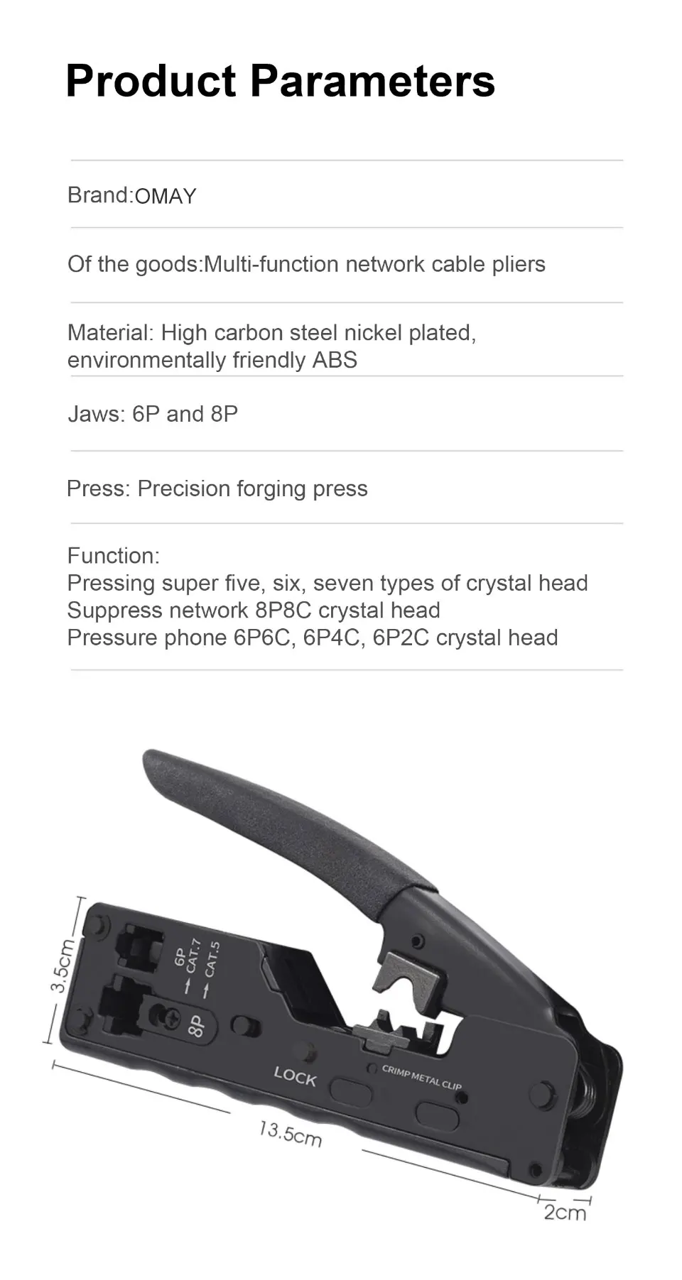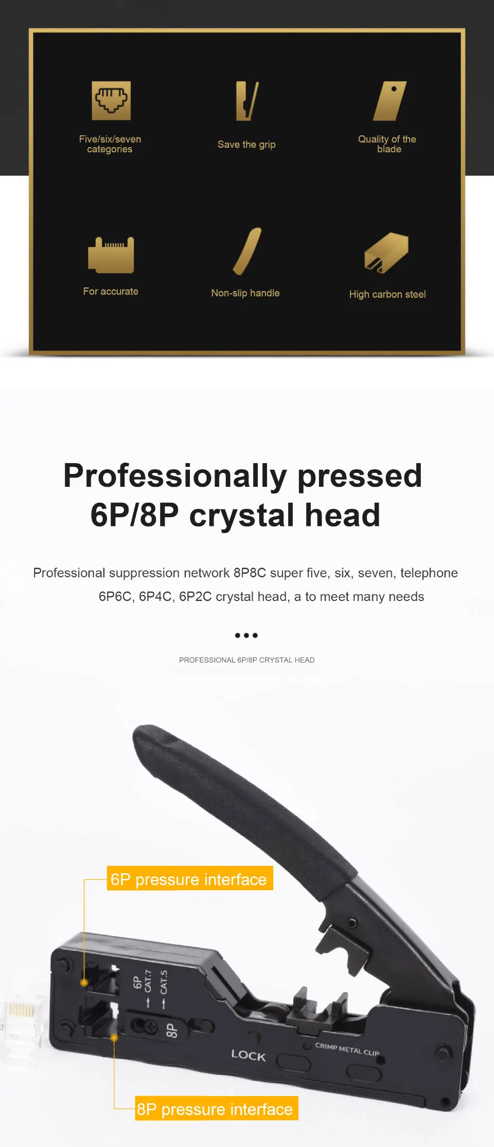 Aplicación de enchufes modulares múltiples: instalación rápida y confiable de conectores de engarzado modulares para aplicaciones de voz y datos.Engarle RJ45 Cat 3/4/5e/6 (8x8) (8P8C), RJ12 6 posiciones (6x6) (6P6C), RJ11 4 posiciones (6x4) (6P4C) y RJ11 2 posiciones (6x2) (6P2C).También funciona para conectores de paso con cuchilla de paso incorporada.