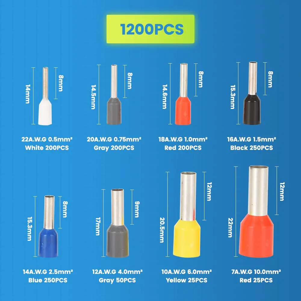 RANGO DE CREMPLAZAMIENTO DE CARRETA: El rango de engarzado es AWG: 28-7 (0,08-10 mm2).Cada kit viene con una práctica pinza para engarzar virolas (cuadrilateral) con 1800 virolas de alambre (AWG: 22-8)