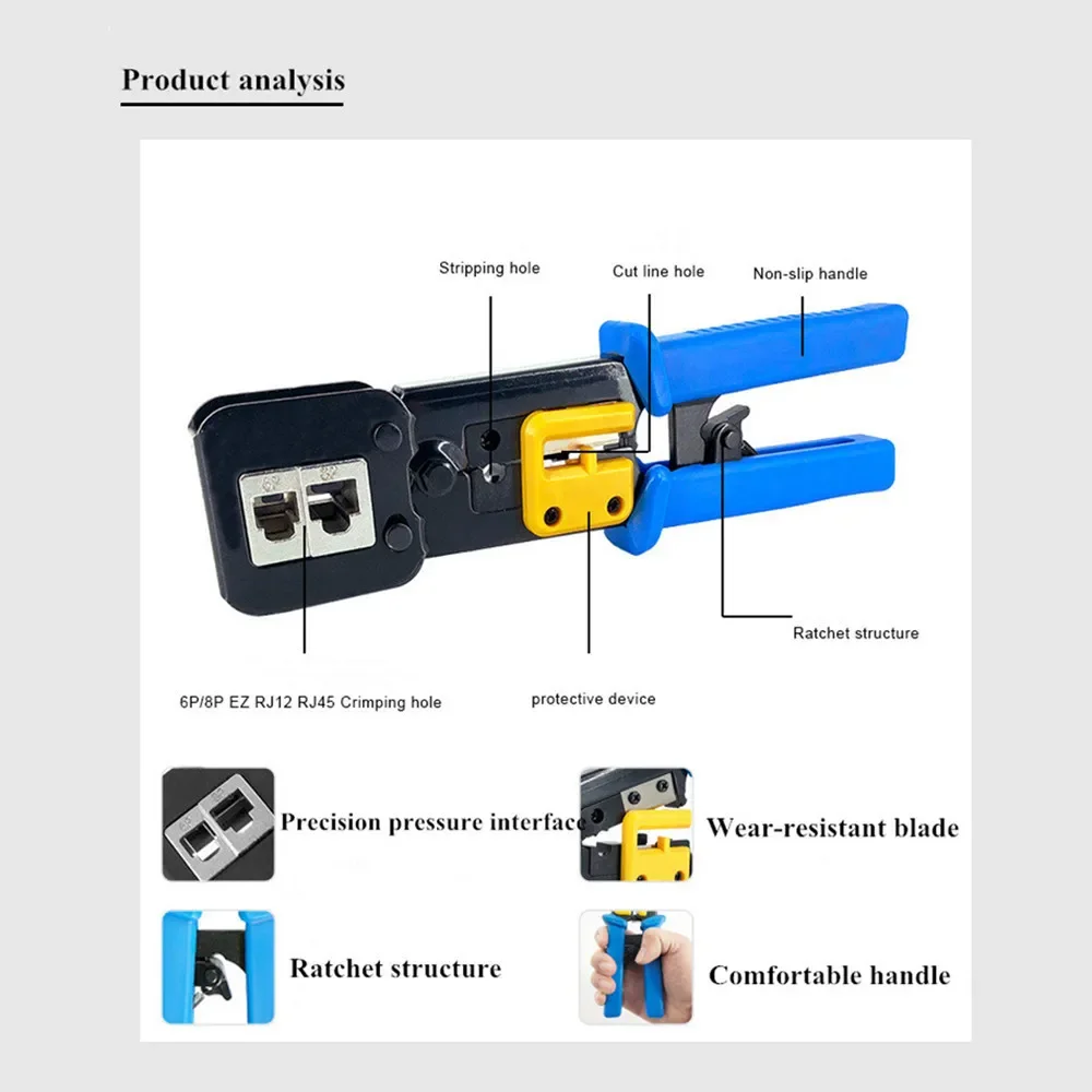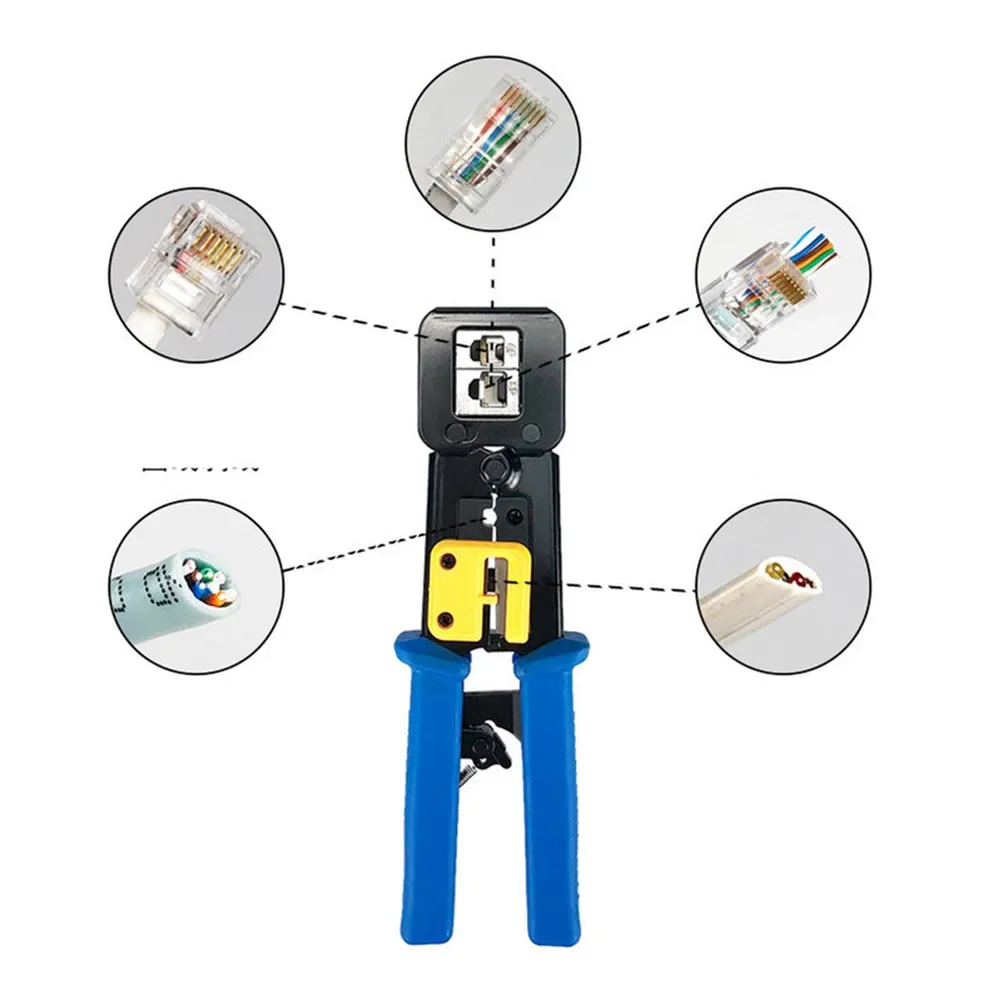 Especificación de engarce: conector convencional y de orificio pasante RJ11/RJ45 (cabeza de cristal convencional y pasante 6P8P) puede pelar cable de par trenzado redondo UTP/STP, línea telefónica plana, se puede romper y tangencial