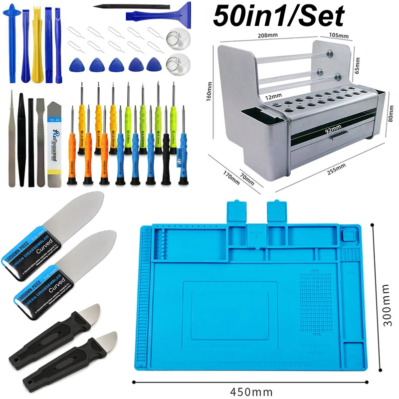 Comprar Herramientas de reparación de teléfonos móviles, Kit de mano de 50 piezas, barra de palanca de apertura, pantalla LCD, destornillador, almohadilla de trabajo de desmontaje, caja de almacenamiento Sta