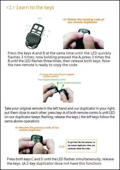 en lugar de códigos sigilosos. No puede copiar el control remoto original del automóvil, el control remoto bidireccional ni el control remoto de código variable (los chips de código rodante comienzan con HCS comúnmente, como HCS200, HCS201, HCS300, HCS301, etc.