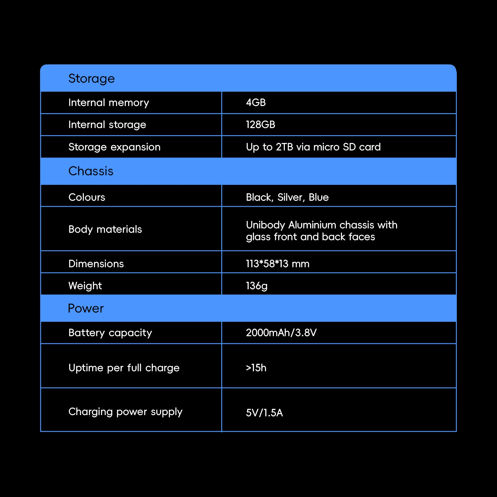 Chasis de aluminio, cristal frontal y trasera.