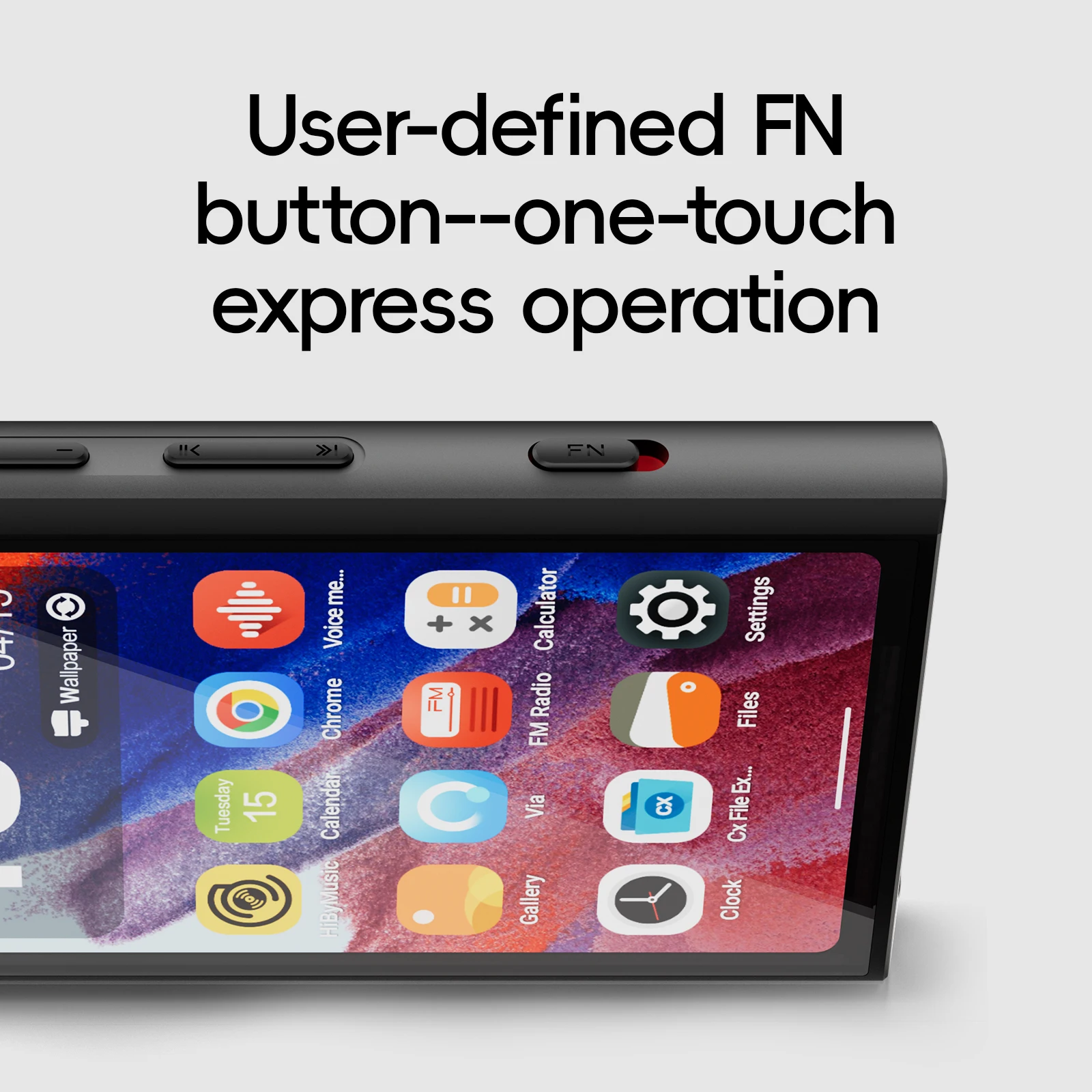 Botón Fn de hardware adicional, las funciones admitidas incluyen: grabación con un solo toque, bloqueo de botones, silencio del altavoz, giro de pantalla, más por venir (a través de actualizaciones de firmware OTA)