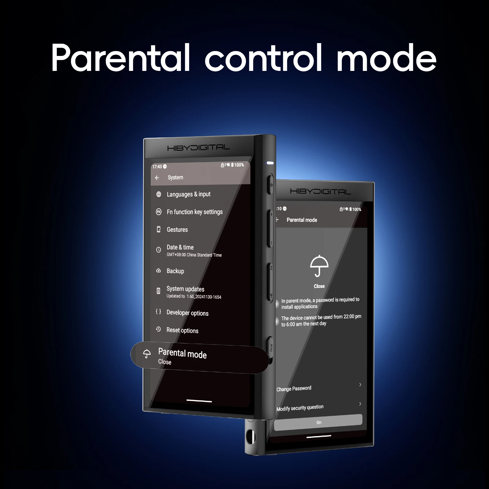 Cuando el modo de control parental está habilitado, se requiere una contraseña para instalar aplicaciones y el dispositivo no se puede utilizar entre las 10:00 y las 6:00 am del día siguiente.