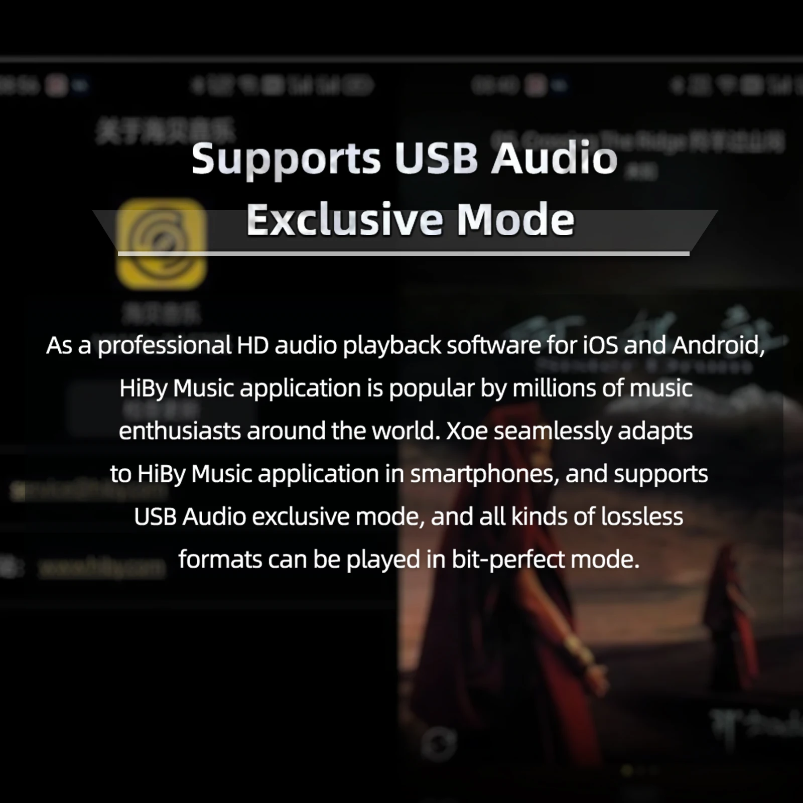 Como software profesional de reproducción de audio HD para sistemas iOS y Android, la aplicación HiBy Music es popular entre millones de entusiastas de la música en todo el mundo. HIBYDIGITAL Xoe se adapta perfectamente a la aplicación HiBy Music en teléfonos inteligentes y admite el modo exclusivo de audio USB, y todo tipo de formatos sin pérdidas se pueden reproducir en el modo perfecto.
