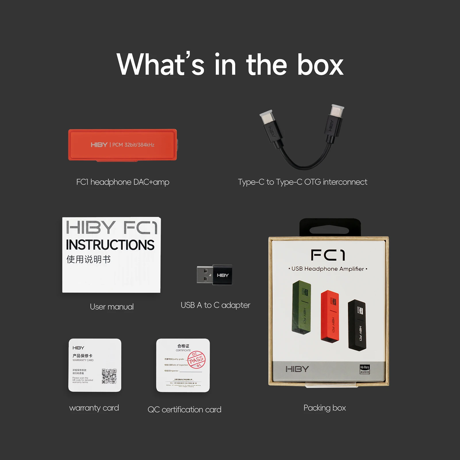 Adaptador USB A a C, manual de usuario, tarjeta de garantía, tarjeta de certificación QC