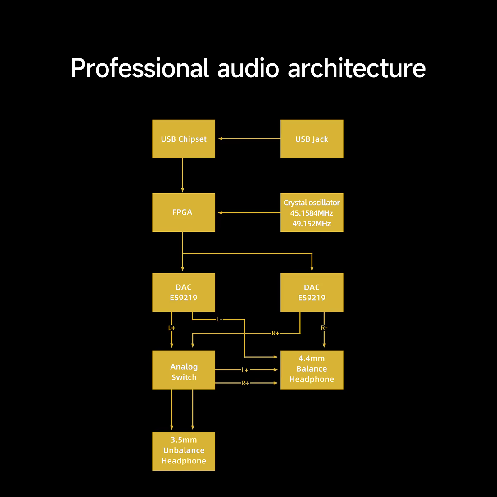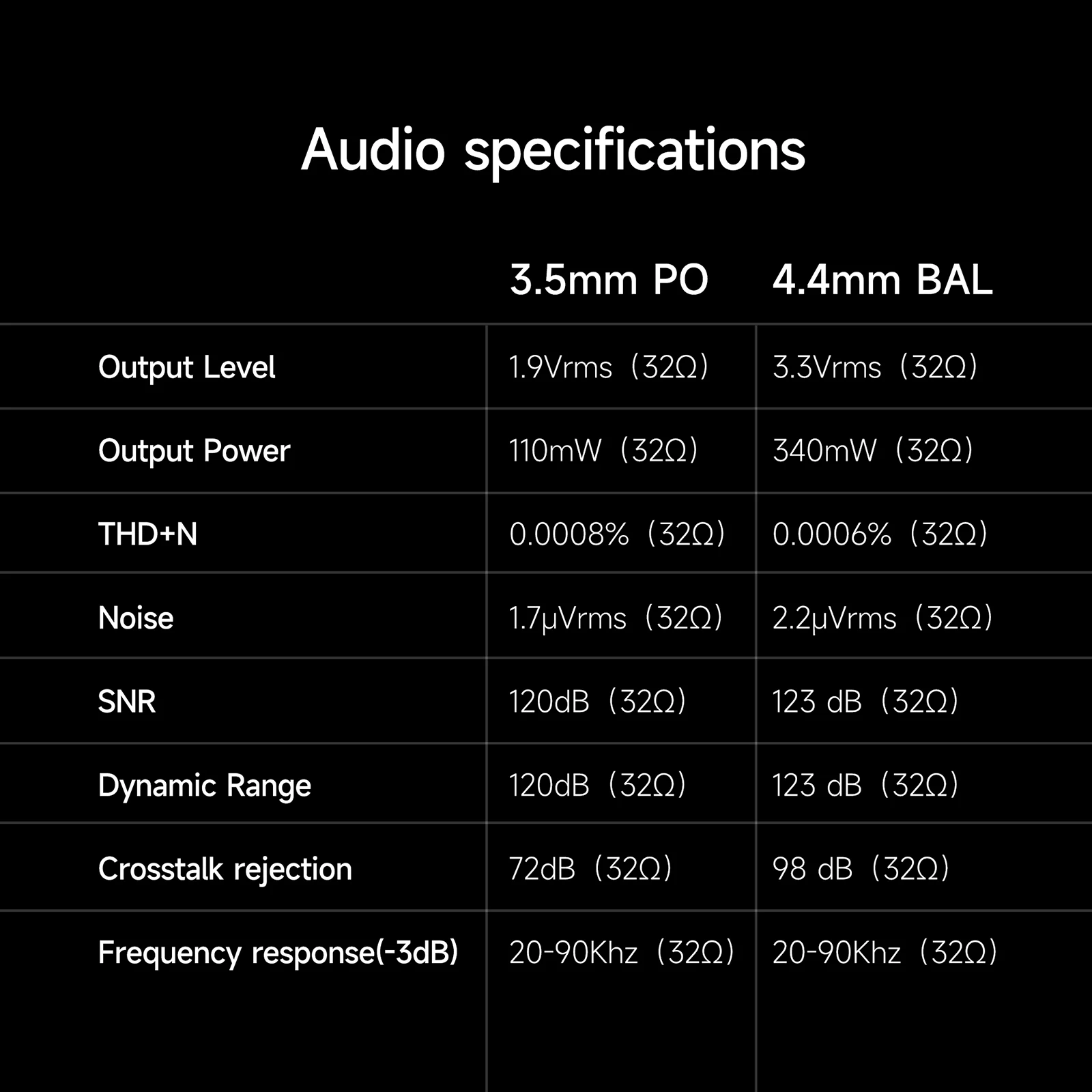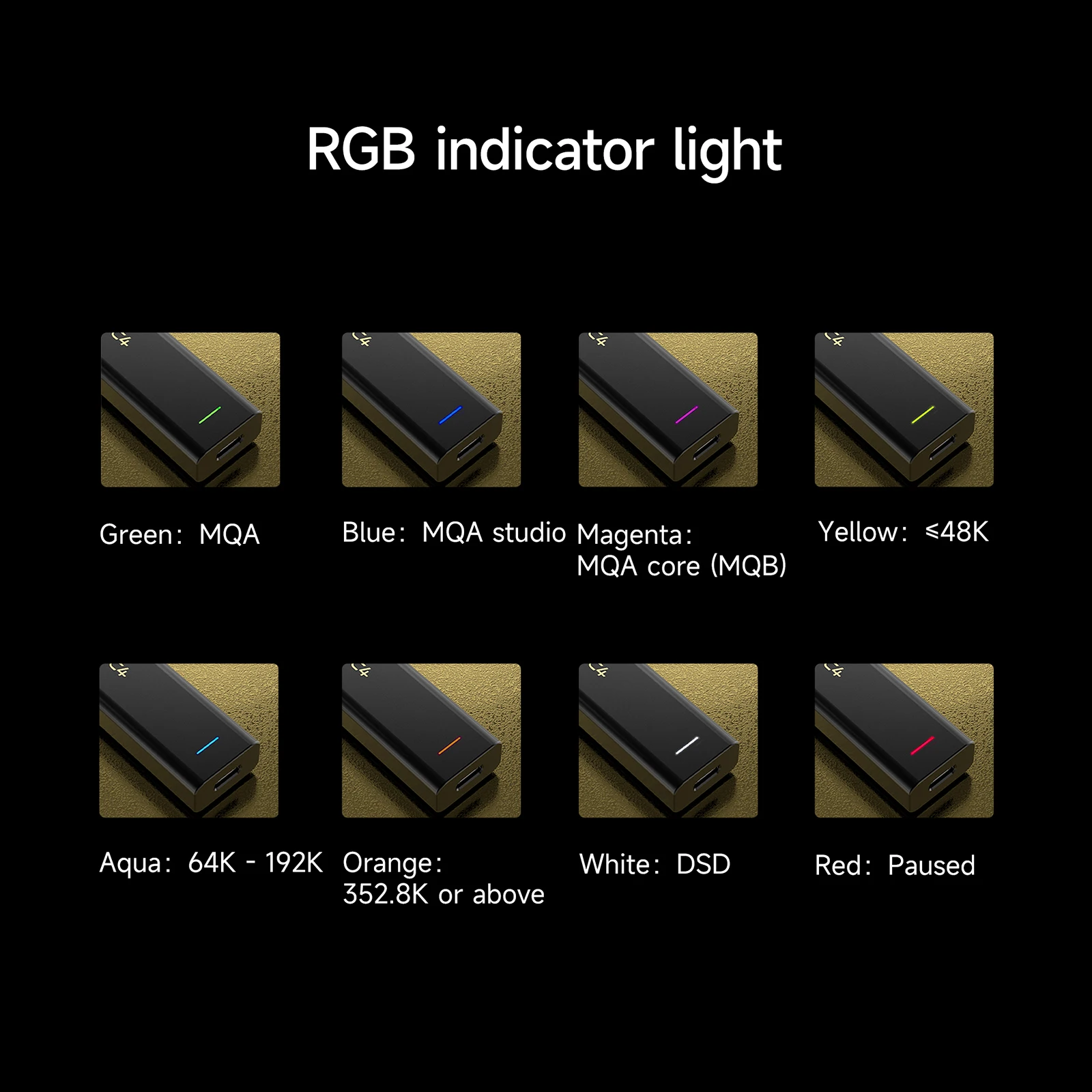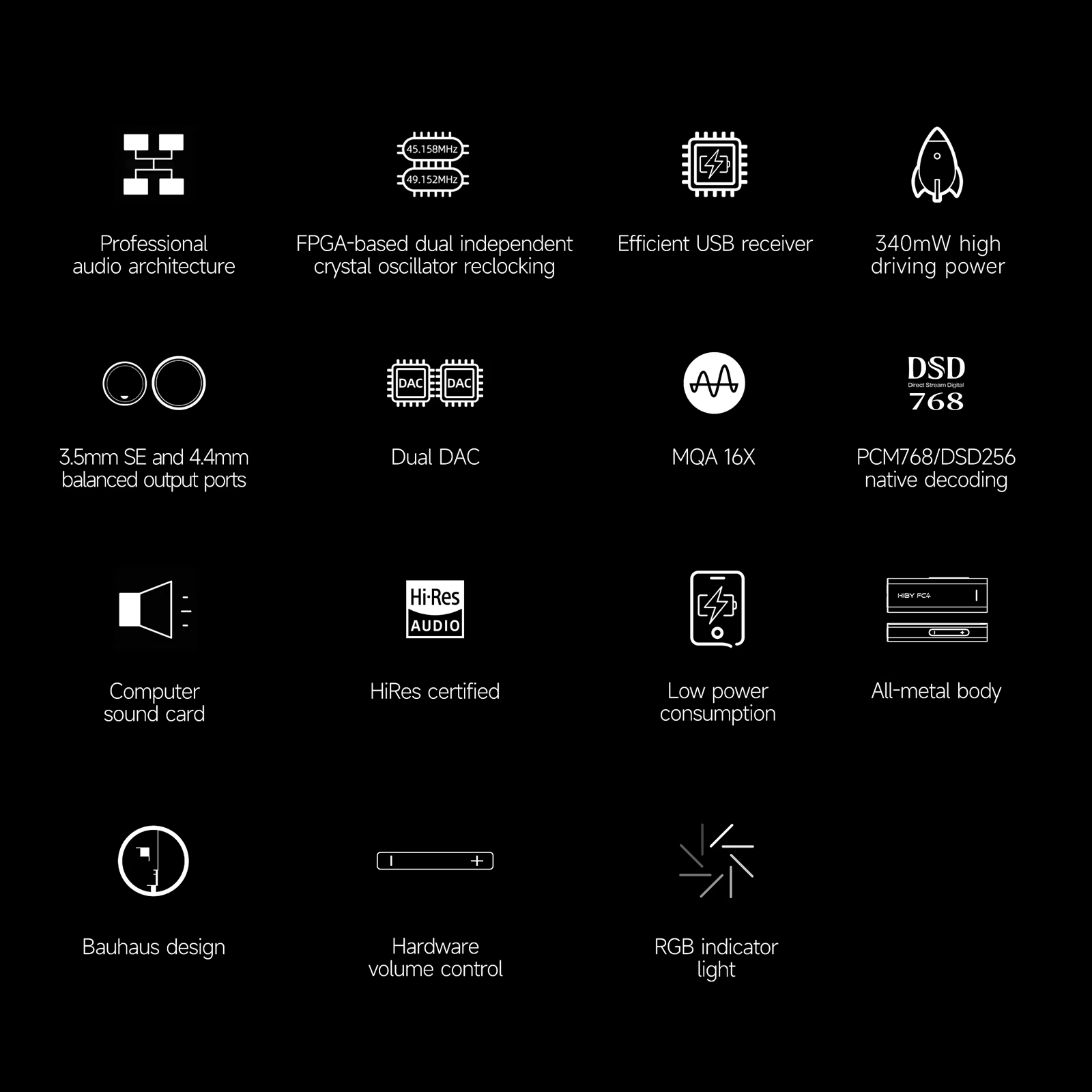 Professional audio architecture, 340mW high driving power, 3.5mm SE and 4.4mm balanced output ports, dual DAC, MQA 8X, PCM768/DSD256 native decoding, computer sound card, HiRes certified, low power consumption, all-metal body, Bauhaus design, hardware volume control, RGB indicator light.