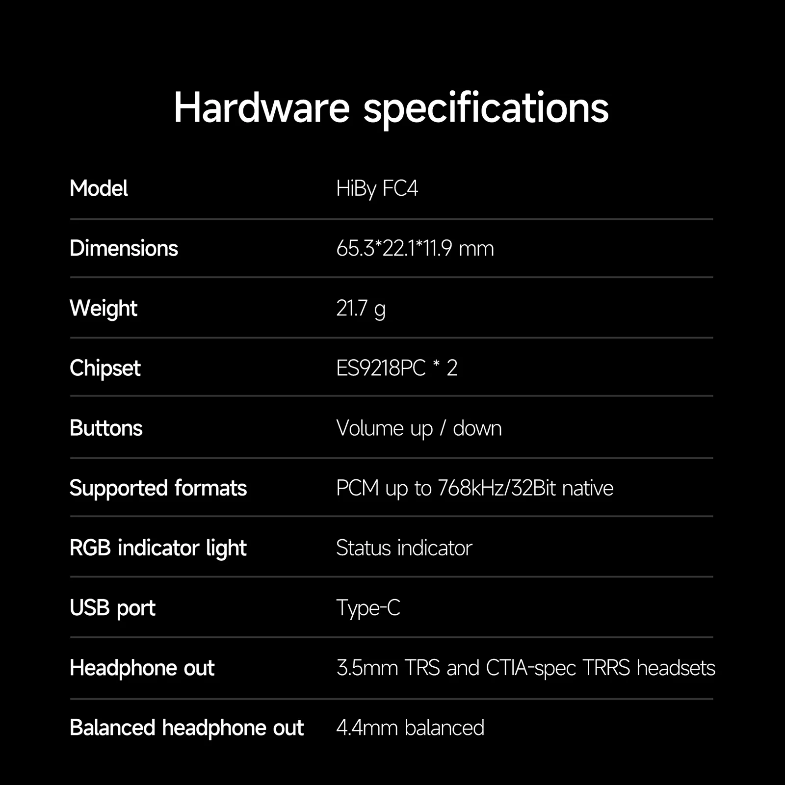 The HiBy FC4 is a portable USB DAC/headphone amp, with high driving power and MQA support. Can be connected to smartphones / computers etc. for use as audio out! High driving power, detailed and energetic sound make the FC4 stand out from the crowd.