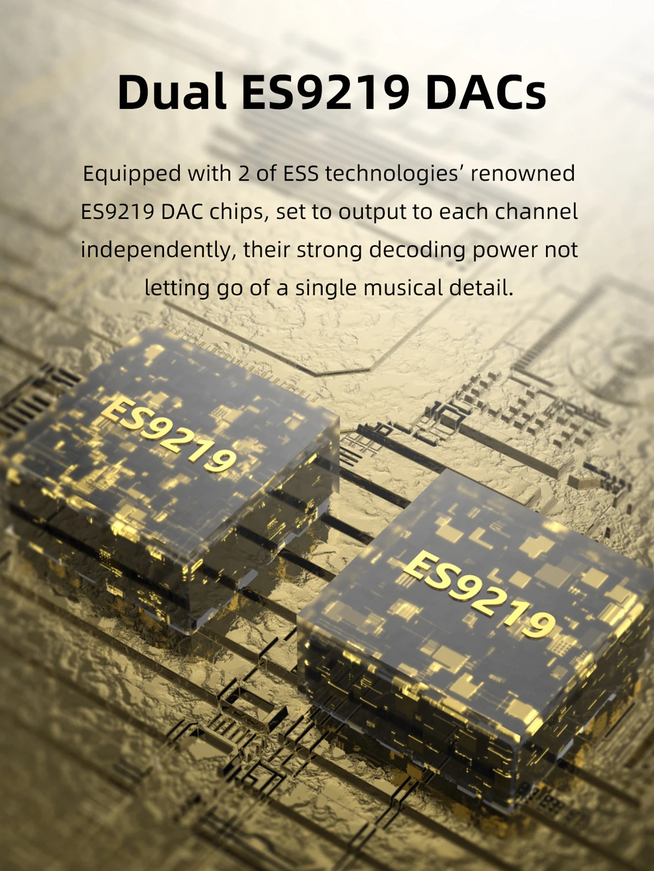 Equipped with 2 of ESS technologies’ renowned ES9219PC DAC chips, set to output to each channel independently, their strong decoding power not letting go of a single musical detail.