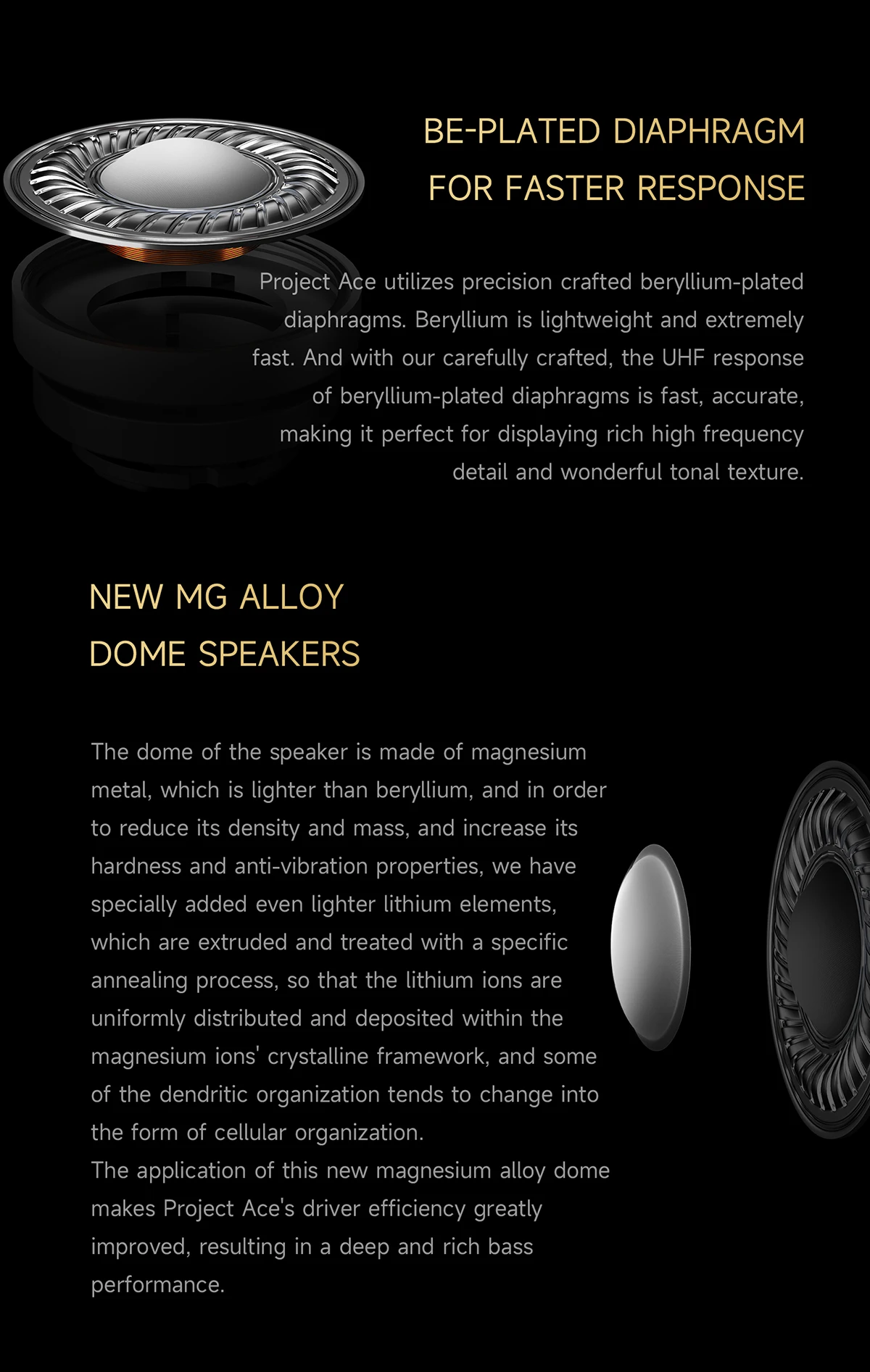 El Proyecto Ace logra una eficiencia de conversión electroacústica superior con Mg-aleación, diafragma Be-placado, bobina mejorada y circuito magnético único.