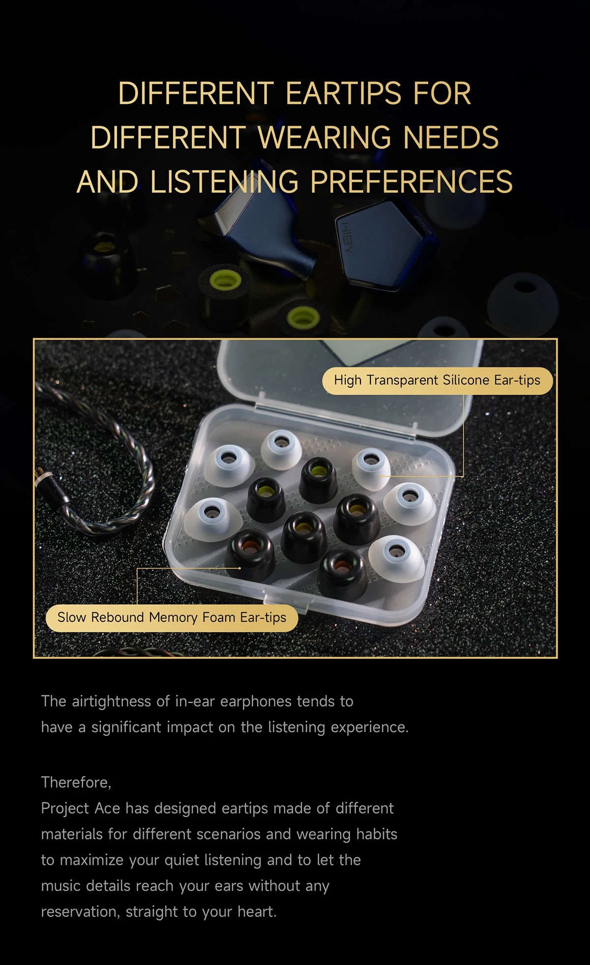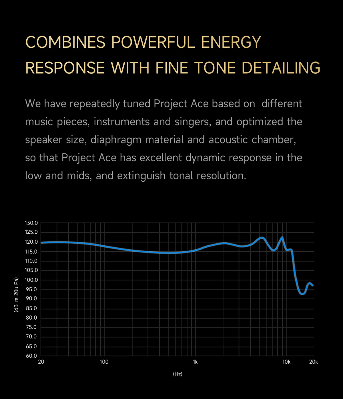 Hemos sintonizado repetidamente los auriculares Project Ace basados en diferentes piezas musicales, instrumentos y cantantes, y optimizamos el tamaño del altavoz, el material del diafragma y la cámara acústica, de modo que el Project Ace tenga una excelente respuesta dinámica en los bajos y medios, y extingue la resolución tonal.