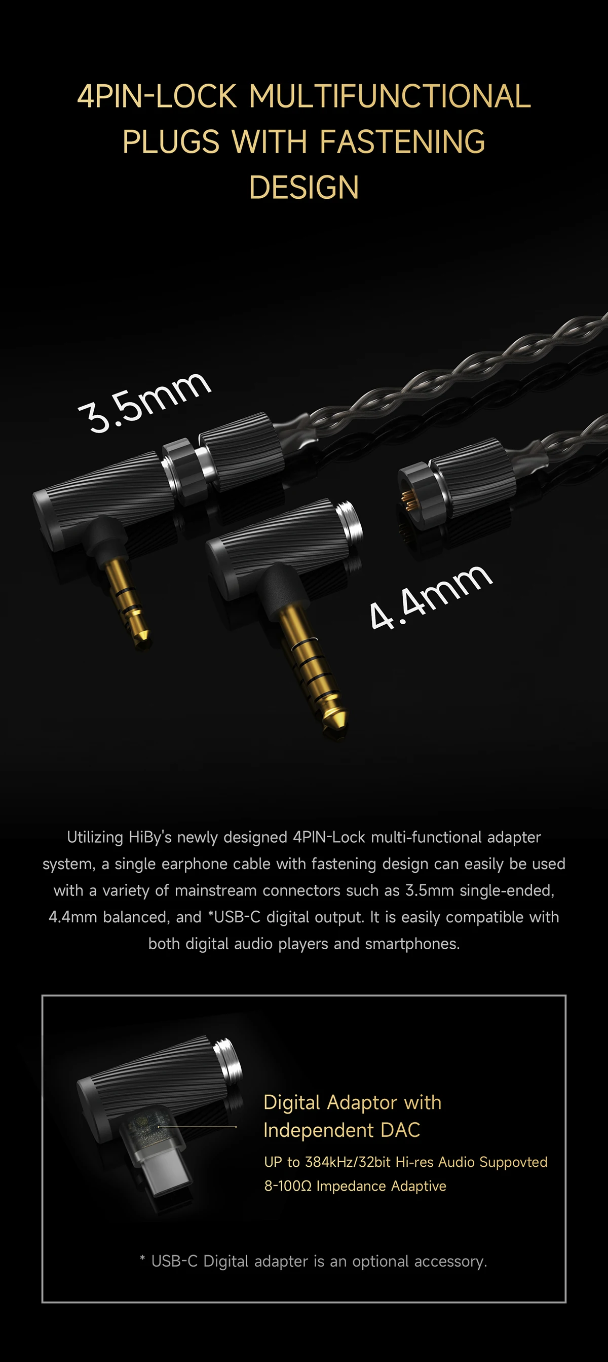 El cable de un solo auricular con diseño de sujeción se puede utilizar fácilmente con una variedad de conectores convencionales, como un solo extremo de 3,5 mm y balanceado de 4,4 mm.