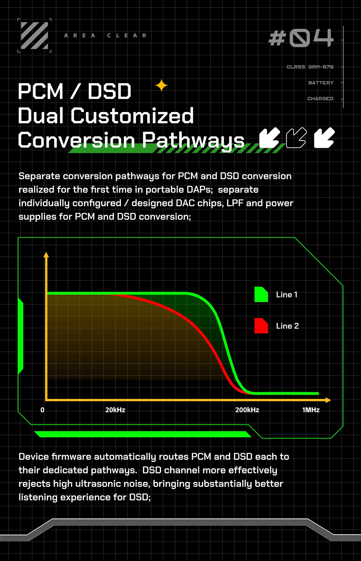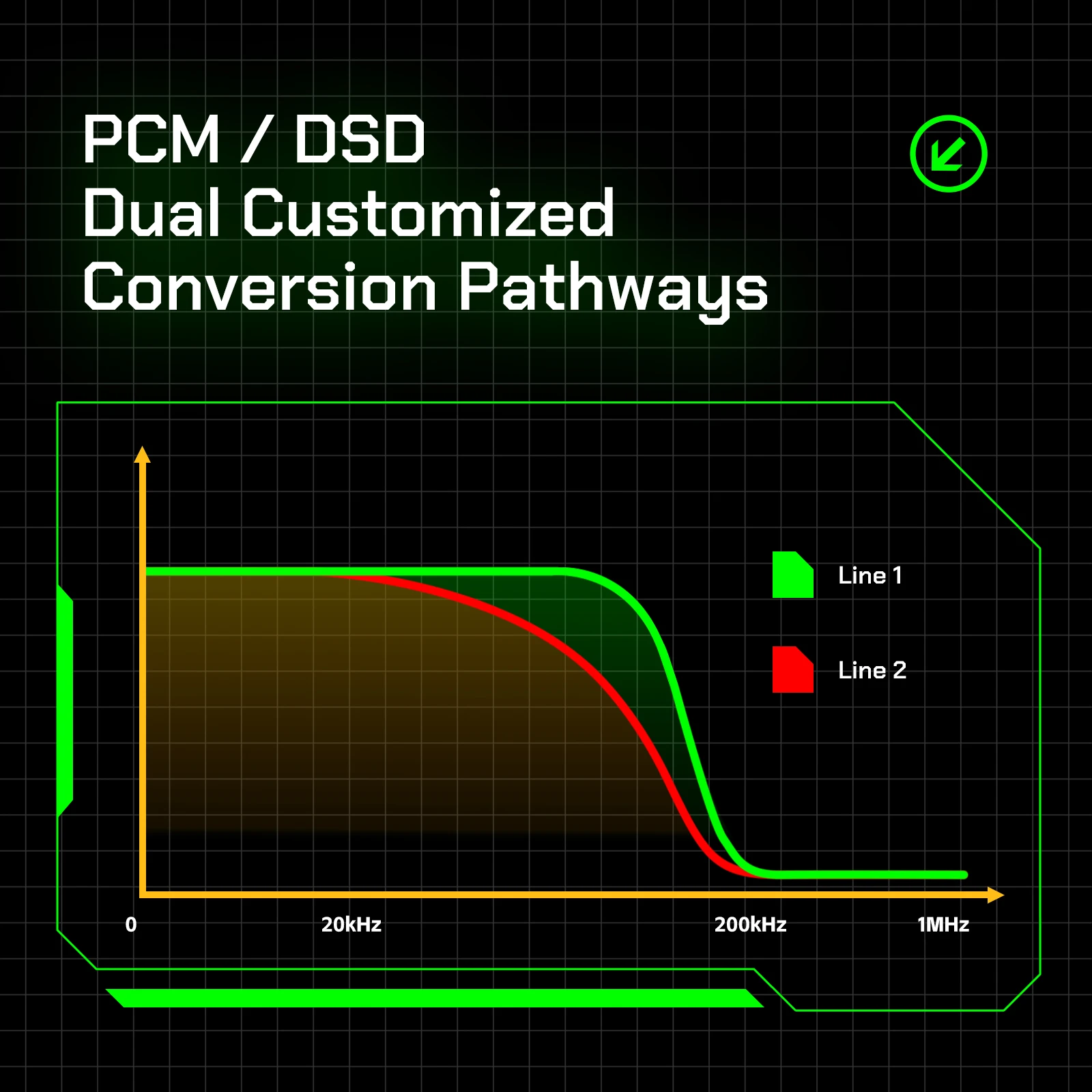 El firmware del dispositivo enruta automáticamente PCM y DSD cada uno a sus caminos dedicados.El canal DSD rechaza de manera más efectiva el alto ruido ultrasónico, brindando una experiencia auditiva sustancial mejor para DSD;