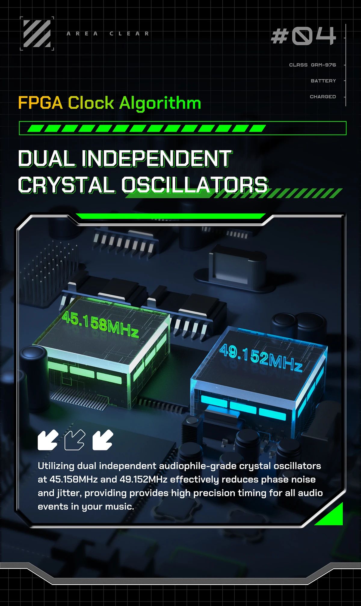 El uso de osciladores de cristal independientes duales de grado audiófilo a 45,158 MHz y 41,152 MHz reduce eficazmente el ruido de fase y la fluctuación, proporcionando una sincronización de alta precisión para todos los eventos de audio de su música.