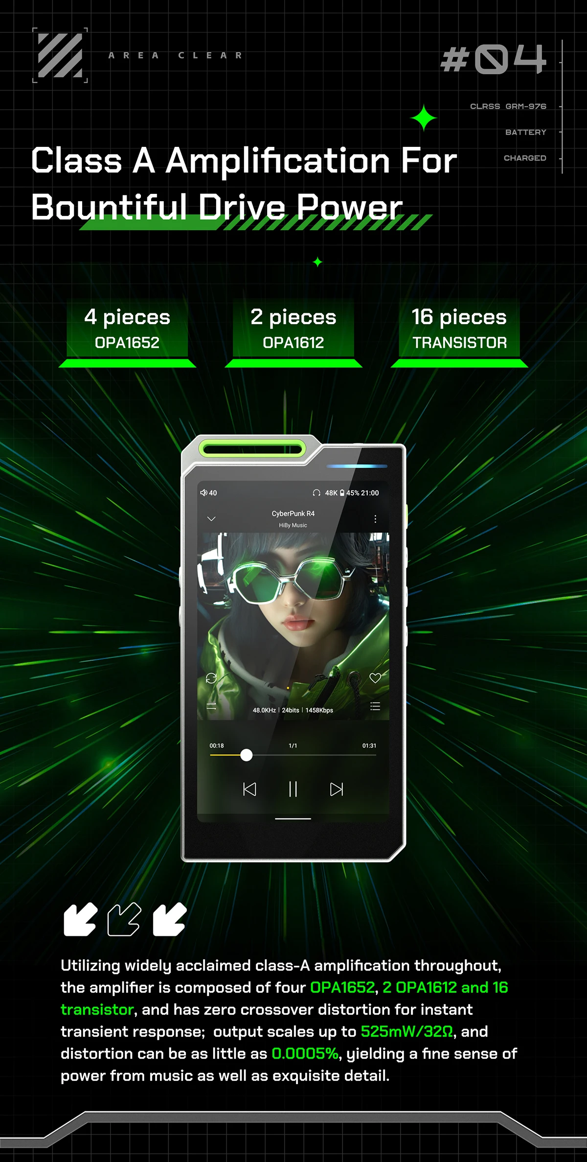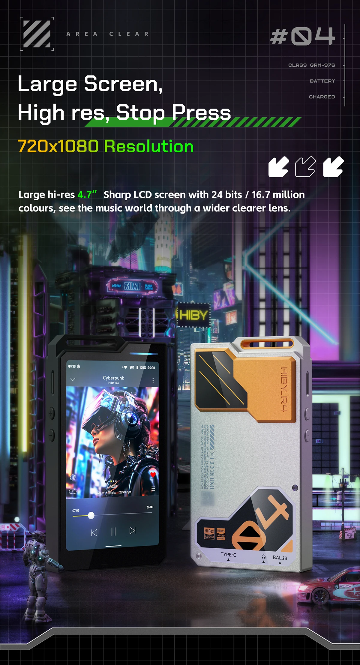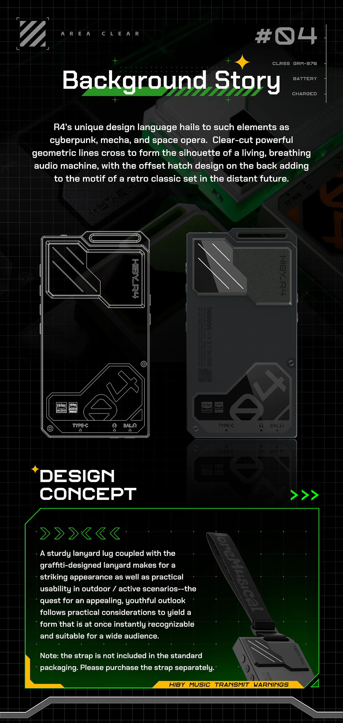 El lenguaje de diseño único de R4 alegra elementos como cyberpunk, mecha y opera espacial.Potentes líneas geométricas cruzadas de corte claro para formar la siueta de una máquina de audio viva y respirable, con el diseño de escotilla desplazada en la parte posterior que se suma al motivo de un conjunto clásico retro en un futuro lejano.