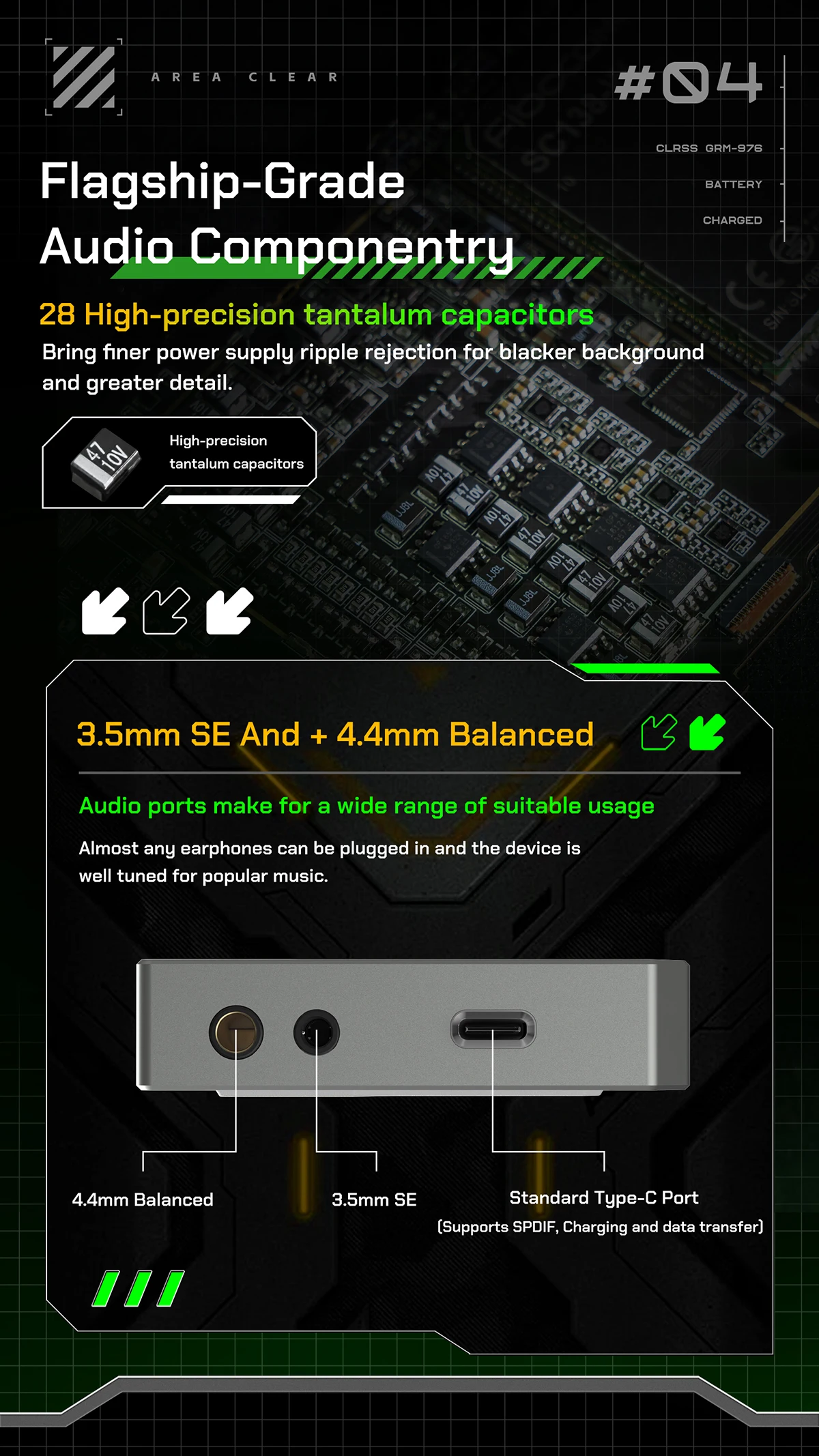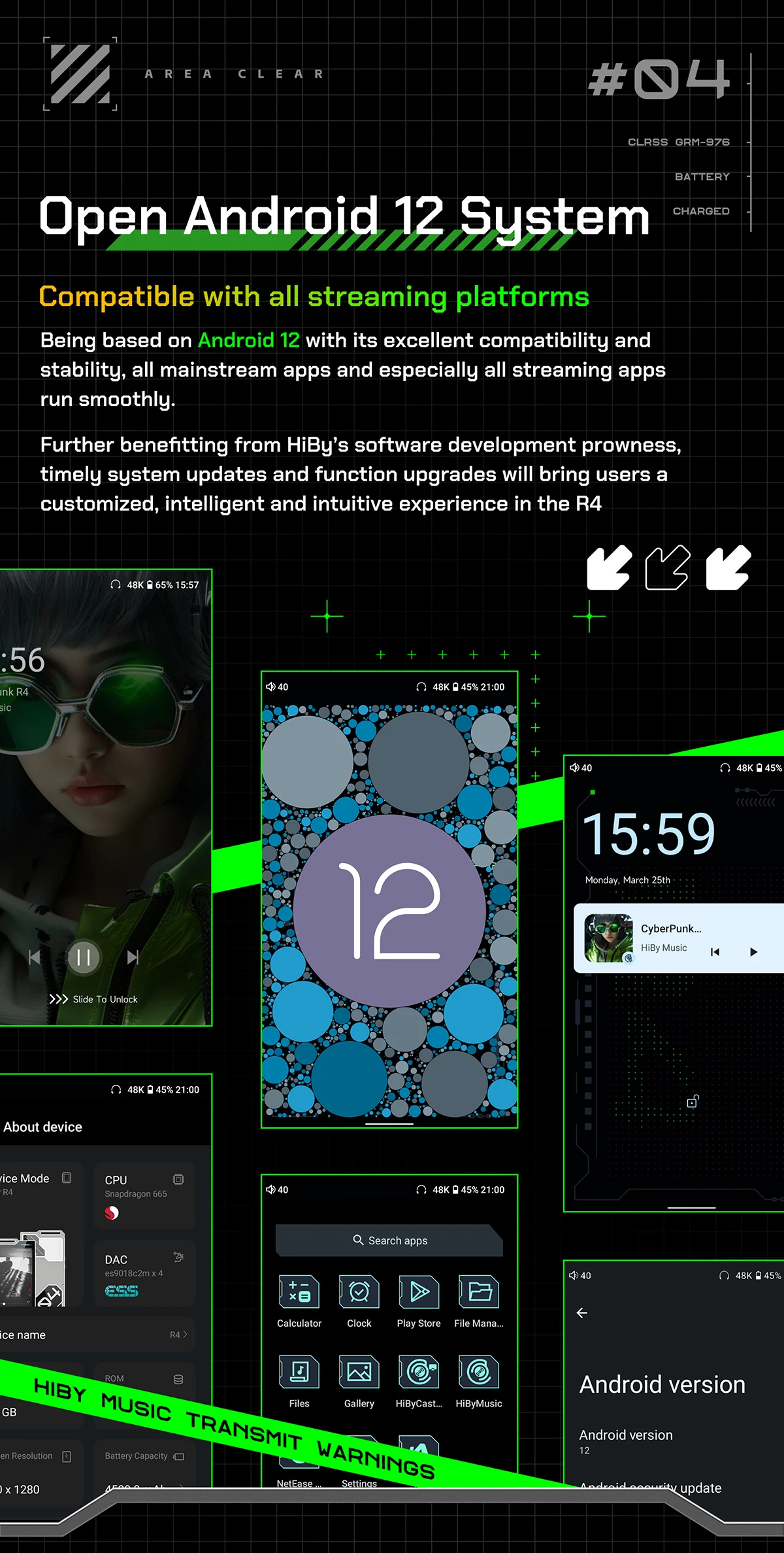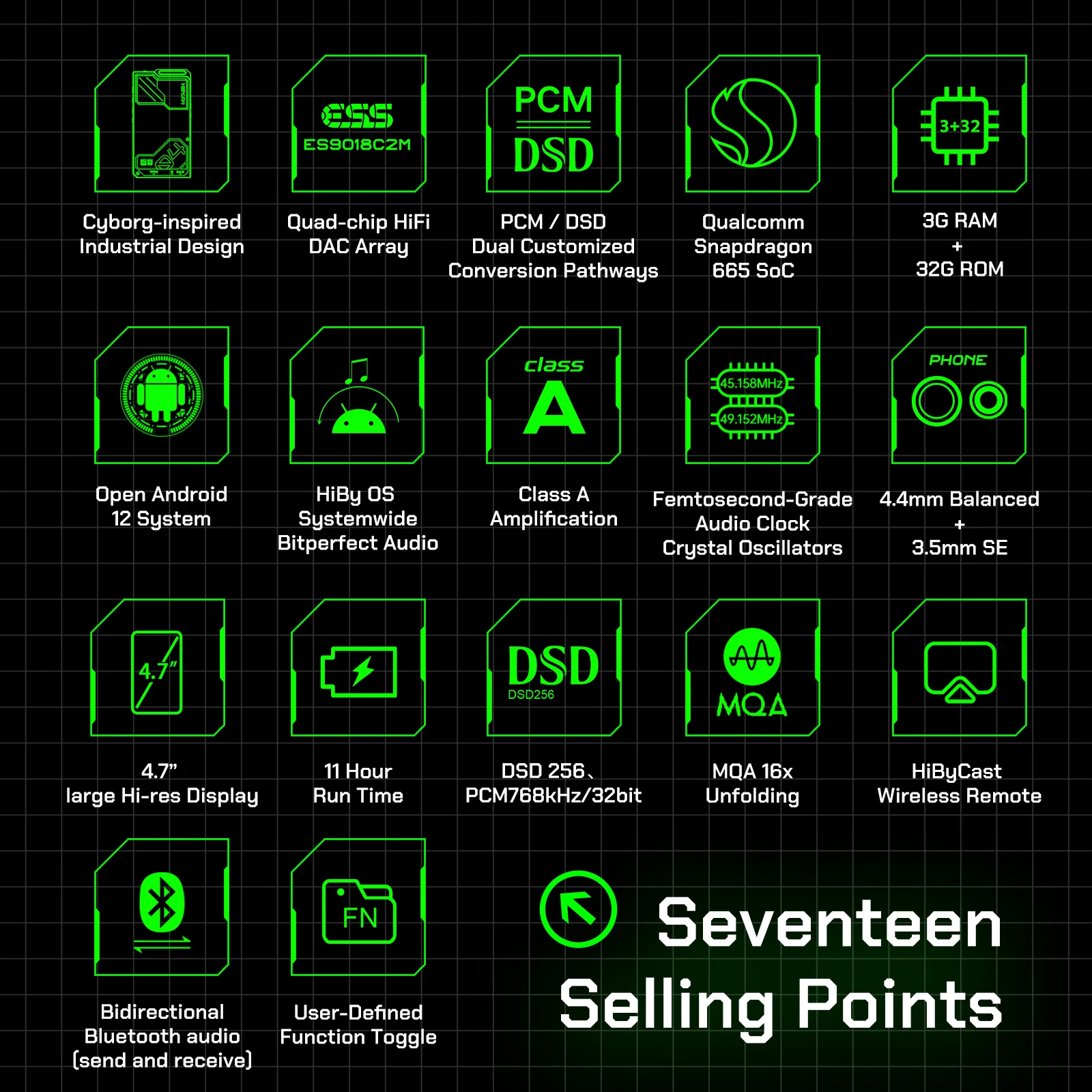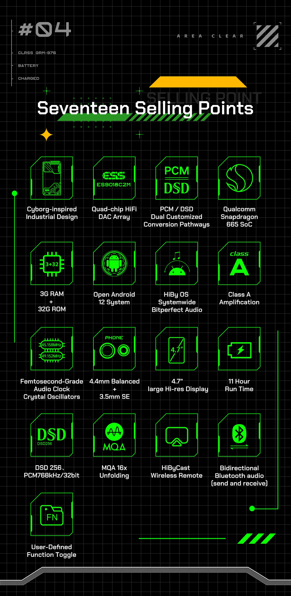 El lenguaje de diseño único de R4 alegra elementos como cyberpunk, mecha y opera espacial.Potentes líneas geométricas cruzadas de corte claro para formar la siueta de una máquina de audio viva y respirable, con el diseño de escotilla desplazada en la parte posterior que se suma al motivo de un conjunto clásico retro en un futuro lejano.