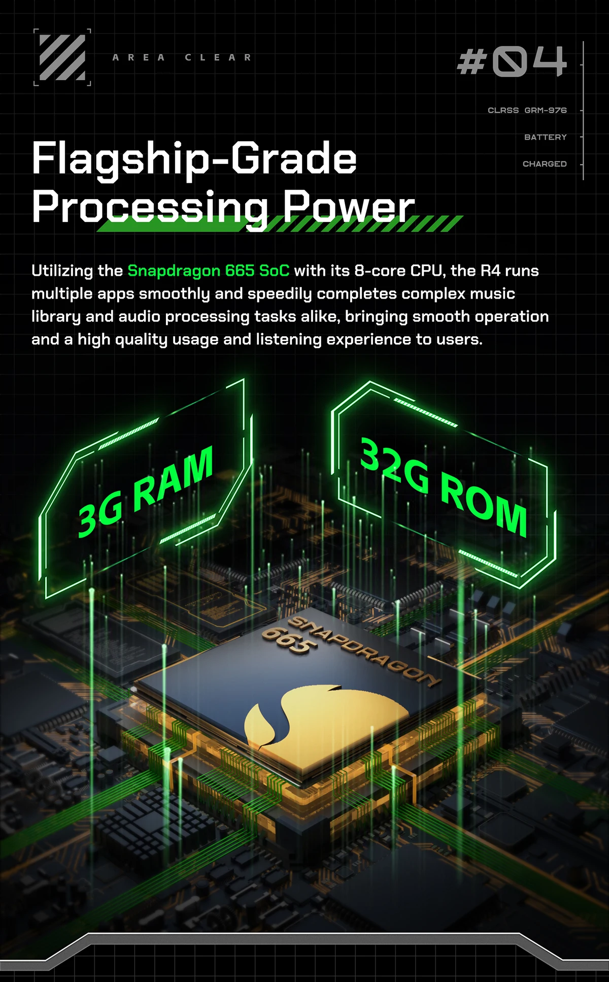 Utilizando el SoC Snapdragon 665 con su CPU de 8 núcleos, el R4 ejecuta múltiples aplicaciones sin problemas y completa rápidamente tareas complejas de biblioteca de música y procesamiento de audio, brindando un funcionamiento fluido y una experiencia auditiva y de uso de alta calidad a los usuarios.