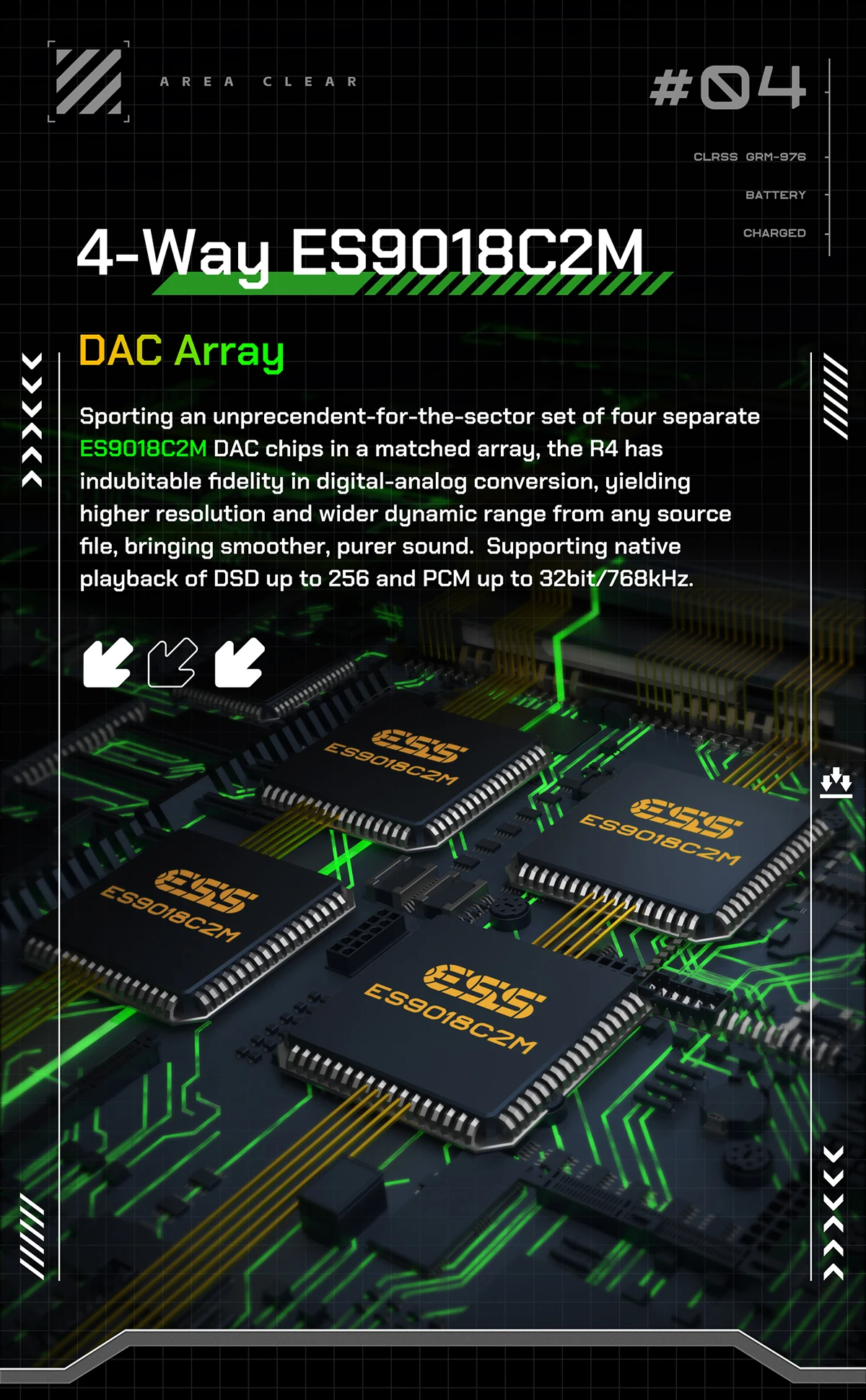Con un conjunto inigualable para el vendedor de cuatro chips DAC ES9018C2M separados en una matriz combinada, el R4 tiene una fidelidad indubitable en la conversión digital-analógica, lo que ofrece una resolución más alta y un rango dinámico más amplio desde cualquier archivo fuente, brindando un sonido más suave y puro..Admite reproducción nativa de DSD de hasta 256 y PCM de hasta 32 bits/768 kHz.