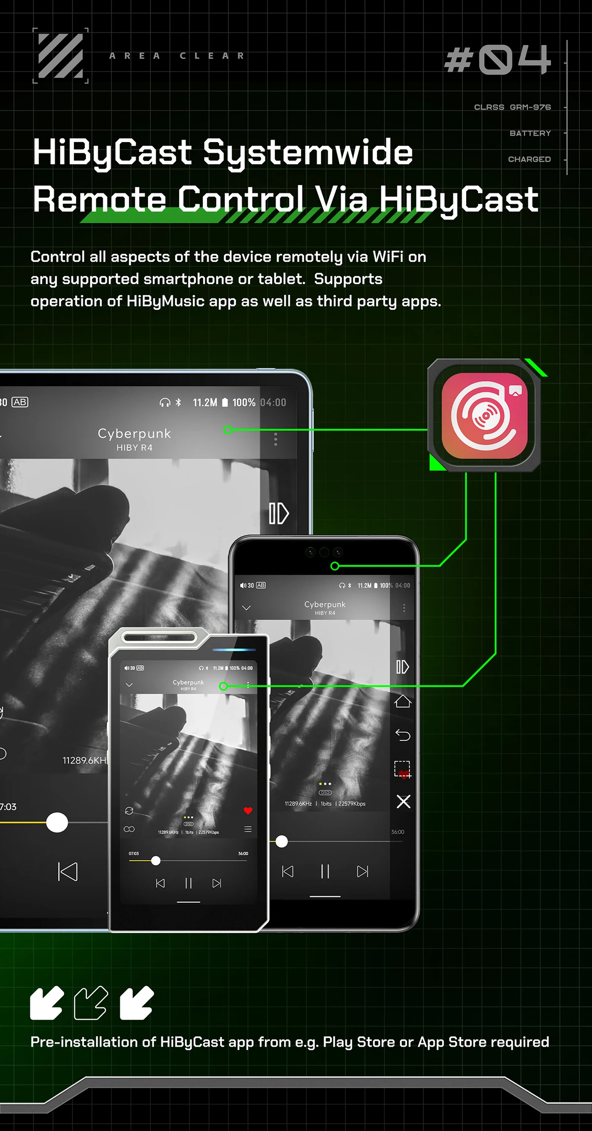 Controle todos los aspectos del dispositivo de forma remota a través de WiFi en cualquier teléfono inteligente o tableta compatible.Admite el funcionamiento de la aplicación HiByMusic y aplicaciones de terceros.