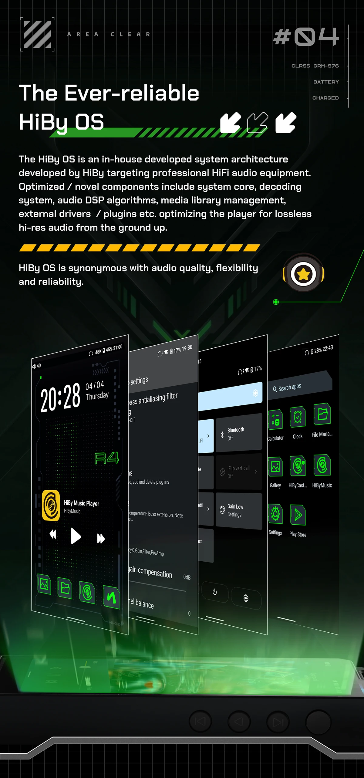 El sistema operativo HiBy es una arquitectura de sistema desarrollada internamente desarrollada por HiBy dirigida a equipos de audio HiFi profesionales.Los componentes optimizados/novos incluyen núcleo del sistema, sistema de decodificación, algoritmos DSP de audio, administración de bibliotecas de medios, controladores/conectadores externos, etc.optimizando el reproductor para obtener audio de alta resolución sin pérdidas desde cero.HiBy OS es sinónimo de calidad, flexibilidad y confiabilidad del audio.