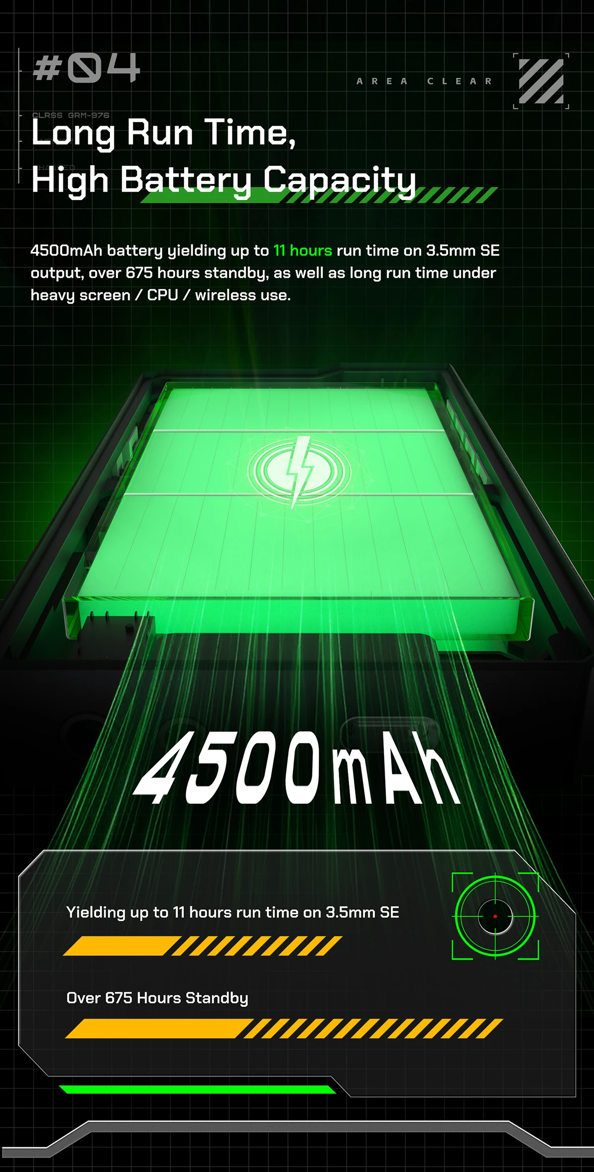 Batería de 4500 mAh que ofrece hasta 11 horas de funcionamiento con salida SE de 3,5 mm, más de 675 horas en espera, así como un tiempo de funcionamiento prolongado bajo pantalla pesada/CPU/uso inalámbrico.