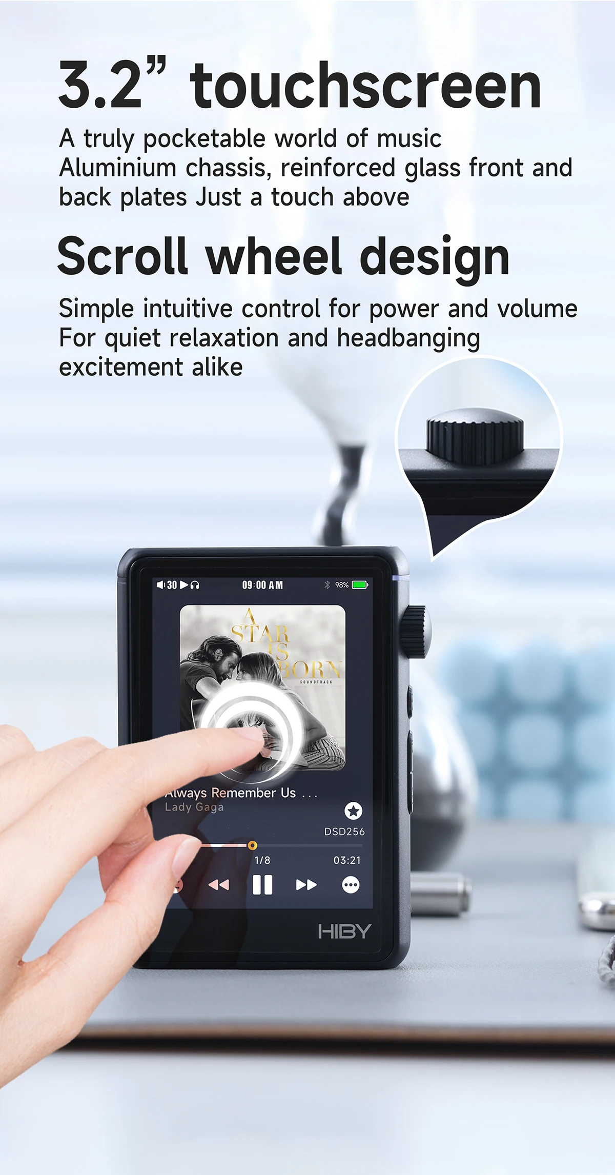 HiBy ha renovado el enfoque de diseño para la serie R3 con un diseño elegante completamente nuevo de R3 II. Es de bolsillo y tiene un cuerpo curvilíneo, con una rueda de volumen elevado en el lateral y teclas de control de medios físicos. La pantalla táctil de 3,2 "se integra maravillosamente en el diseño y proporciona un enfoque más claro. Tiene un control intuitivo simple para la potencia y el volumen.