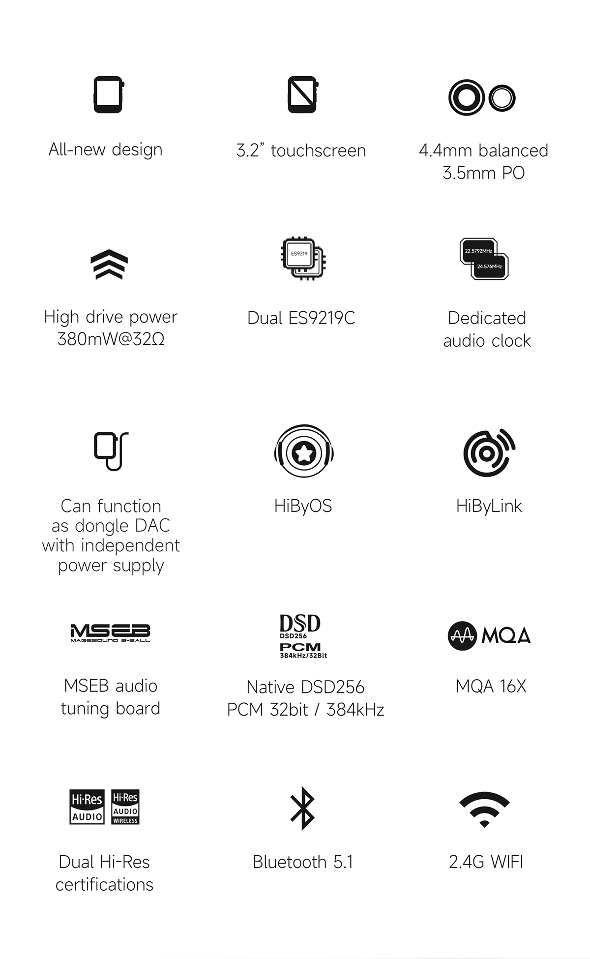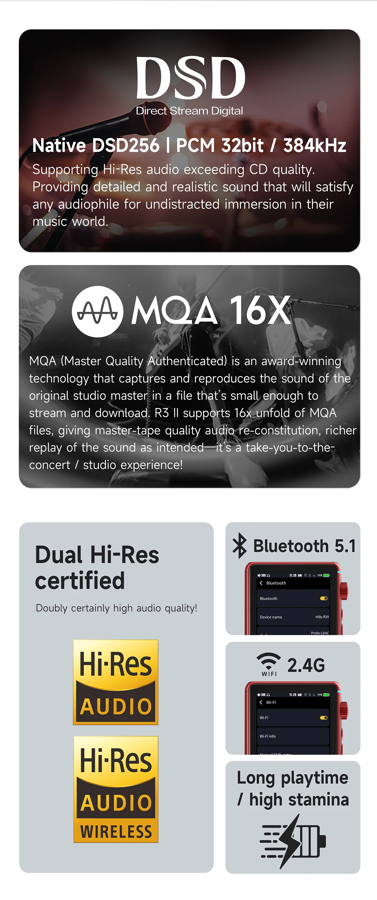 Presentamos el nuevo HiBy R3 II, la última generación de reproductor de audio portátil de alta resolución de HiBy. Con un diseño completamente nuevo, doble chipset DAC ES9219C de alto rendimiento, diseño de pantalla táctil de 3,2 ", salida de 4,4mm, soporte MQA y muchas más características, el R3 II es un reproductor fantástico que se adapta a todos los requisitos para el uso diario. HiBy R3 II es compatible con todos los formatos de música líderes, admite señales de audio DSD256 nativas, señales PCM de 32 bits/384kHz y hasta 16x MQA desplegándose también. Es un DAP increíble que proporciona una experiencia auditiva excepcional.
