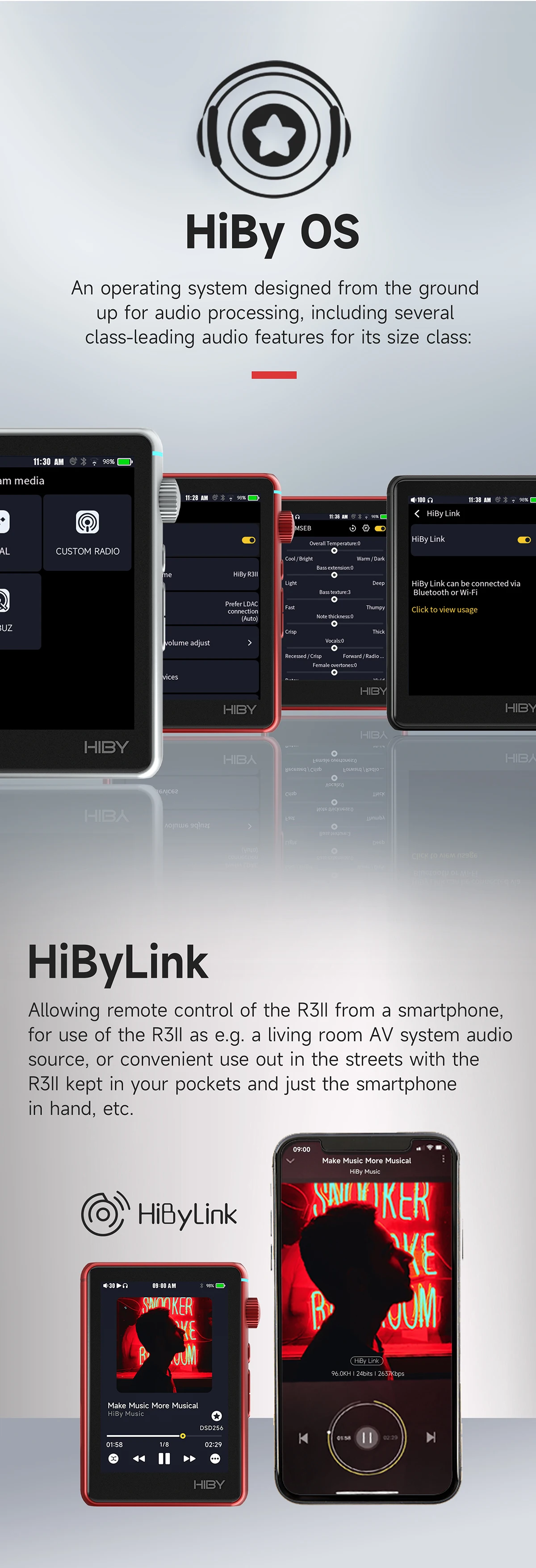 HiBy R3 II viene cargado con el sistema operativo HiBy OS diseñado desde cero para el procesamiento de audio y proporciona una experiencia de escucha de audio excepcional. La compatibilidad con HiBy Link permite a los usuarios controlar fácilmente la reproducción a través de sus teléfonos inteligentes.